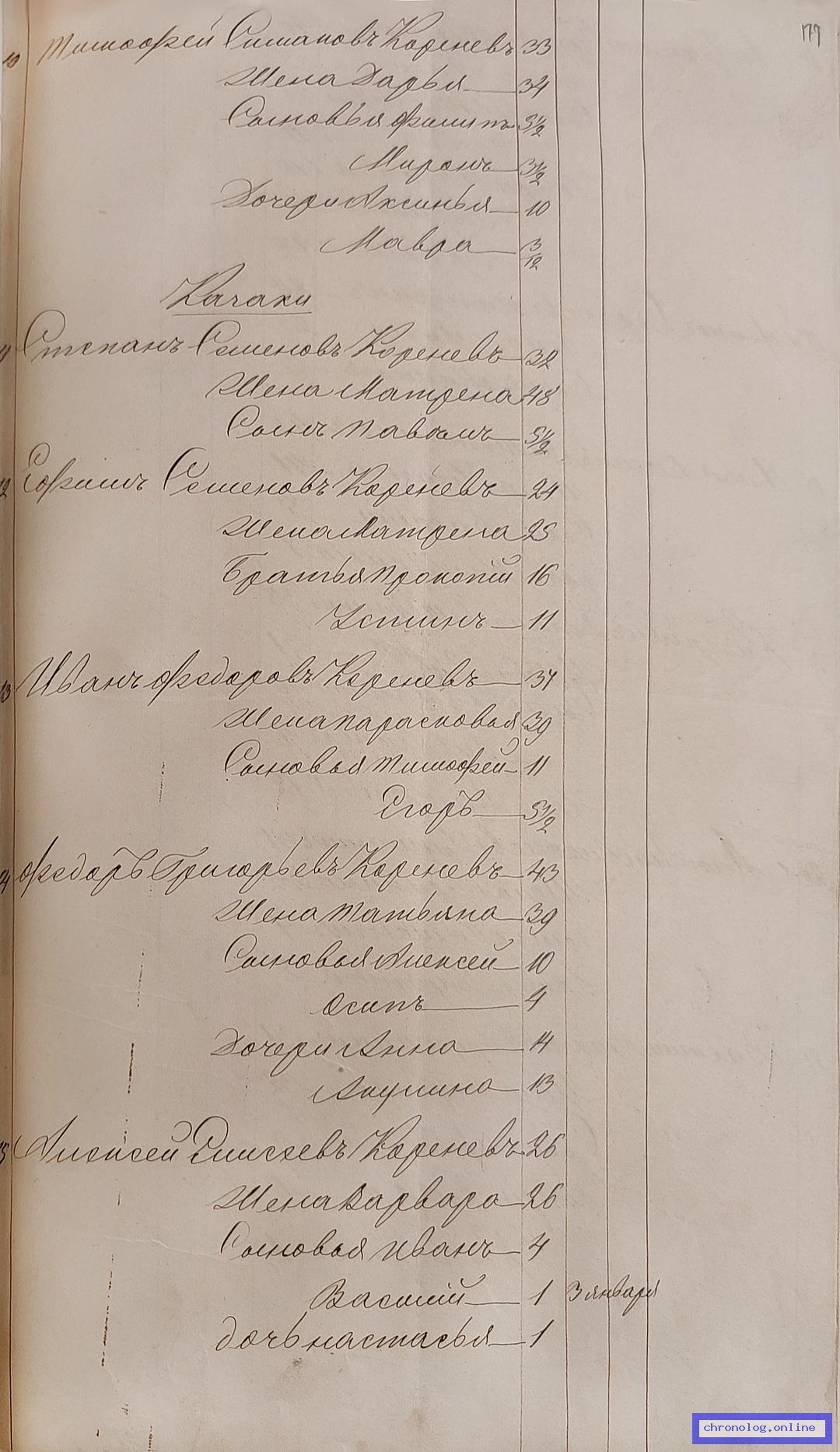 ГАЗК 30-2-270, Л.34, 179 (Посемейные списки переселенцев на р. Амур): Казак 4-го пешего батальона Алексей Елисеевич Коренев 26 жена Варвара 26 сыновья Иван 4 Василий 1 родился 03.01.1860 дочь Настасья 1. Исход: село Батаканское Нерчинского уезда. Снимки: 34, 179. | |||