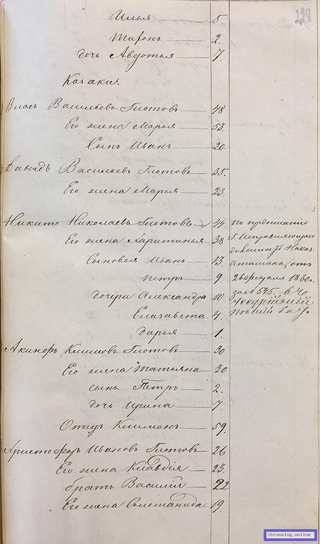 ГАЗК 30-2-270, Л.103об, 229 (Посемейные списки переселенцев на р. Амур): Казак 10-го пешего батальона Никита Николаевич Глотов 44 его жена Харитинья 38 сыновья Иван 13 Пётр 9 дочери Александра 10 Елизавета 4 Дарья 1. Исход: деревня Красноярская Нерчинского уезда. Снимки: 103об, 229. | |||