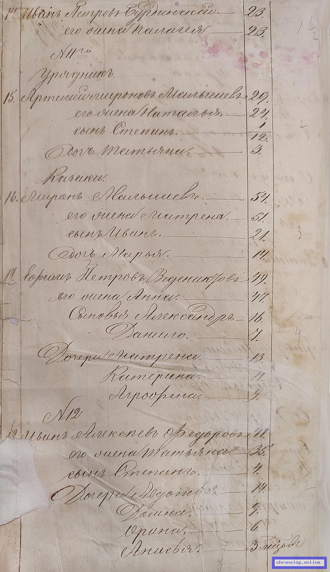 ГАЗК 30-2-270, Л.96, 96об, 214, 224 (Посемейные списки переселенцев на р. Амур): Казак 9-го пешего батальона Иван Логинович Тюменцов 26 его жена Аксинья 24 сын Иван 1 отец Лога Исакович 59 его жена Агафья 58 их сын Митрофан 14 дочь Глафира 20. Исход: деревня Митрофанова Нерчинского уезда. Снимки: 96, 96об, 214, 224. | |||