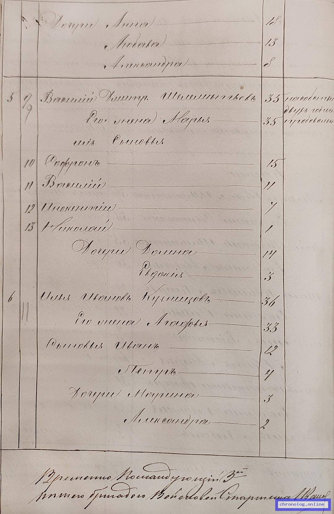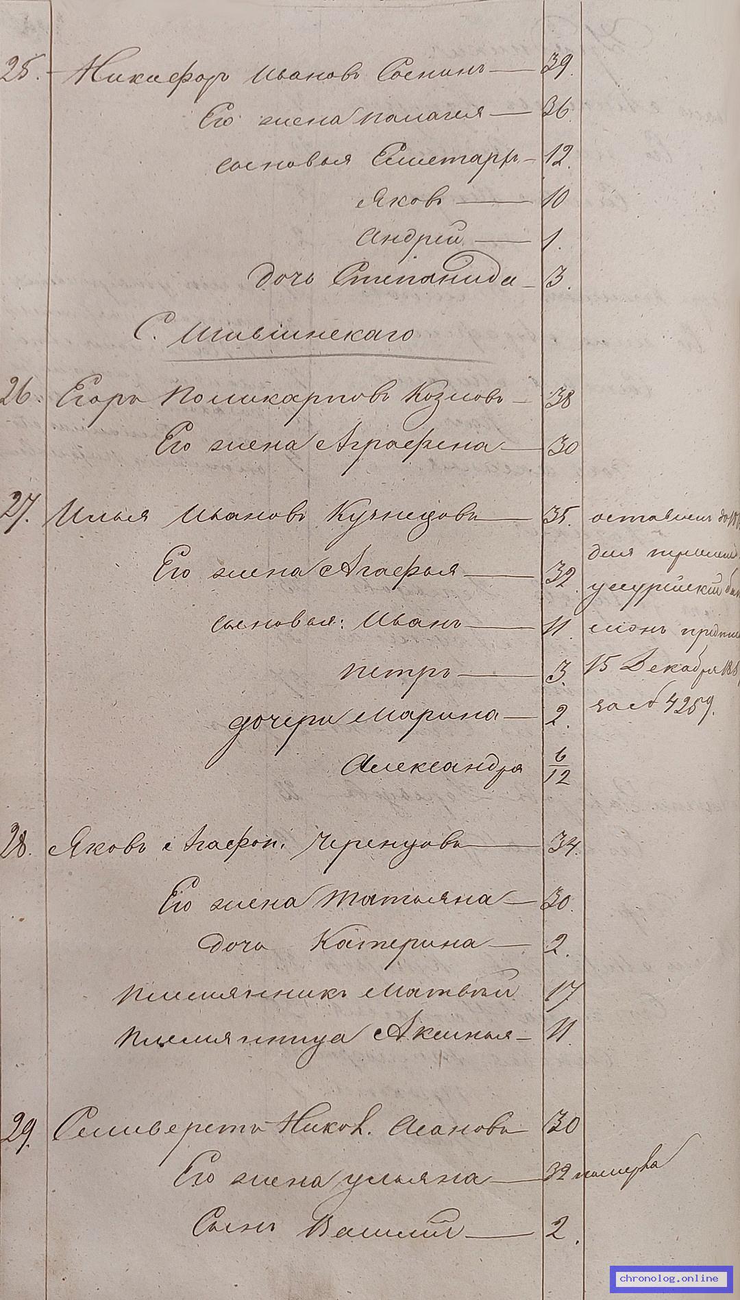 ГАЗК 30-2-270, Л.111об, 240об, 264об, 272об (Посемейные списки переселенцев на р. Амур): Казак 11-го пешего батальона Илья Иванович Кузнецов 36 жена Агафья 33 сыновья Иван 12 Пётр 4 дочери Марина 3 Александра 2. Исход: село Шивеинское Нерчинского уезда. Снимки: 111об, 240об, 264об, 272об. | |||