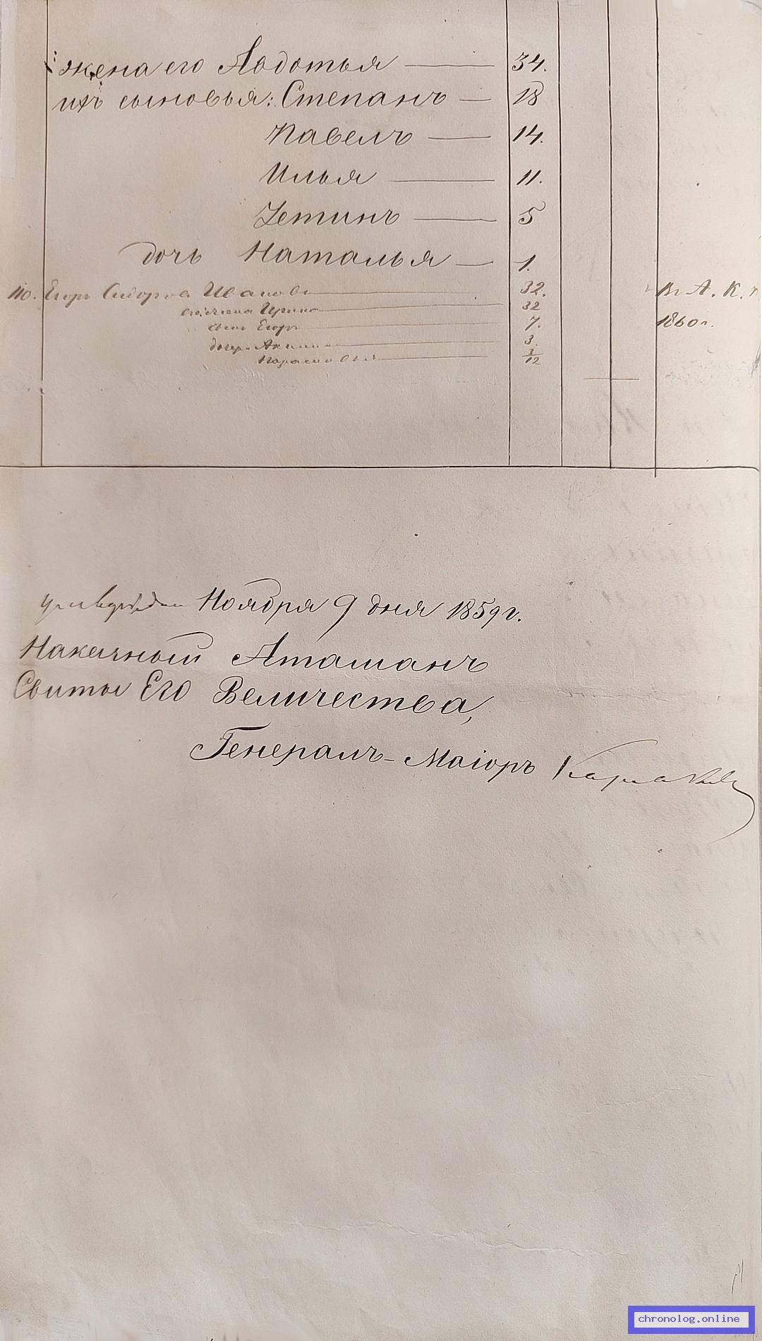 ГАЗК 30-2-270, Л.8, 8об, 152 (Посемейные списки переселенцев на р. Амур): Казак 1-го пешего батальона Алексей Дмитриевич Козлов 44 жена его Аграфена 33 сыновья Дмитрий 19 Тимофей 14 Матвей 13 дочери Маланья 17 Устинья 11 Степанида 7. Исход: село Донинское Нерчинского уезда. Снимки: 8, 8об, 152. | |||