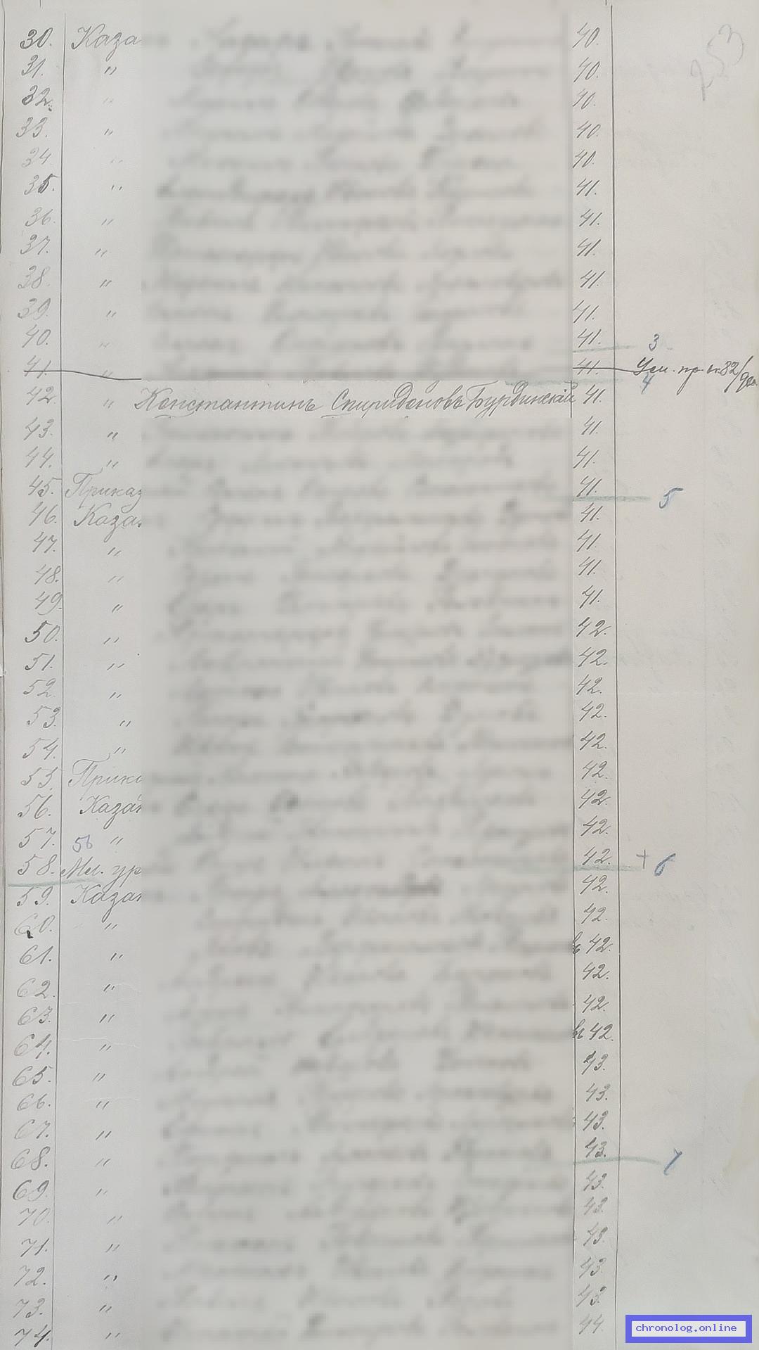 РГИАДВ 793-1-419, Л.253 (Списки казакам, вахмистрам, урядникам Амурского казачьего войска по возрастам, разрядам и округам на 1900 год): Казак Константин Спиридонович Бурдинский 41 года из посёлка Пузиновского показан в списке ополчения по Екатерининскому станичному округу. Время и место исхода не показано. Снимки: 253. | |||