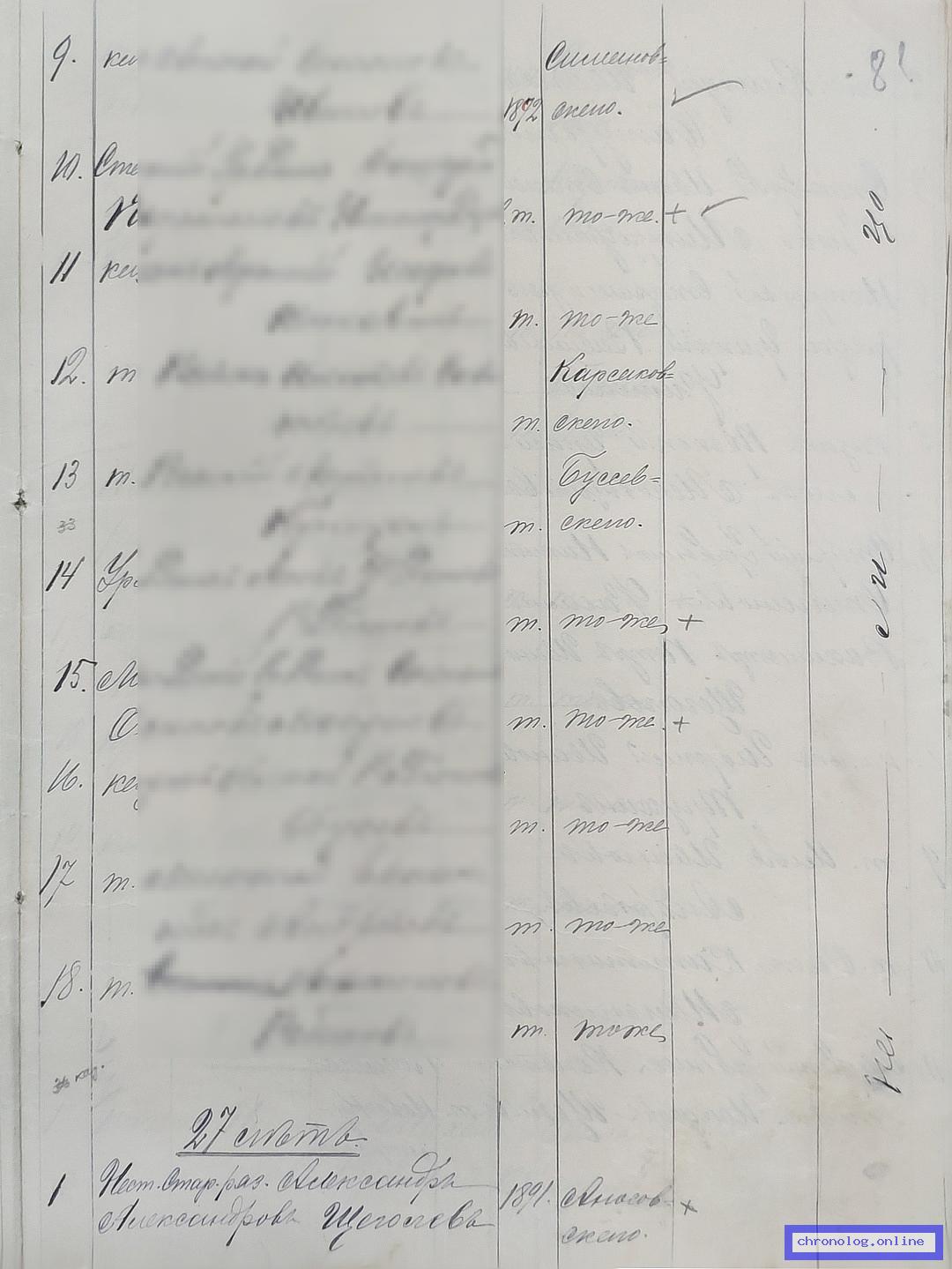 РГИАДВ 704-4-344, Л.15об (Список крестьян Амурской области, подлежащих отбытию повинностей в 1882 году): Крестьянин деревни Сергеевской Чечин Михаил 25 лет. Время и место исхода не показано. Снимки: 15об. | |||