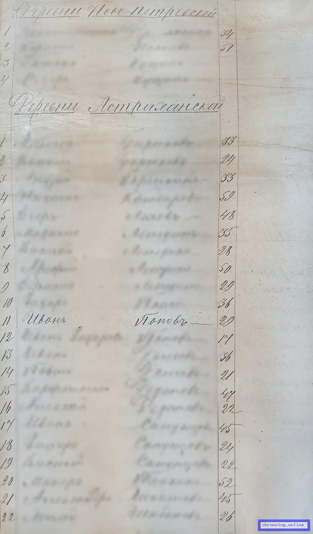 РГИАДВ 704-4-344, Л.17об (Список крестьян Амурской области, подлежащих отбытию повинностей в 1882 году): Крестьянин деревни Астраханки Попов Иван 29 лет. Время и место исхода не показано. Снимки: 17об. | |||