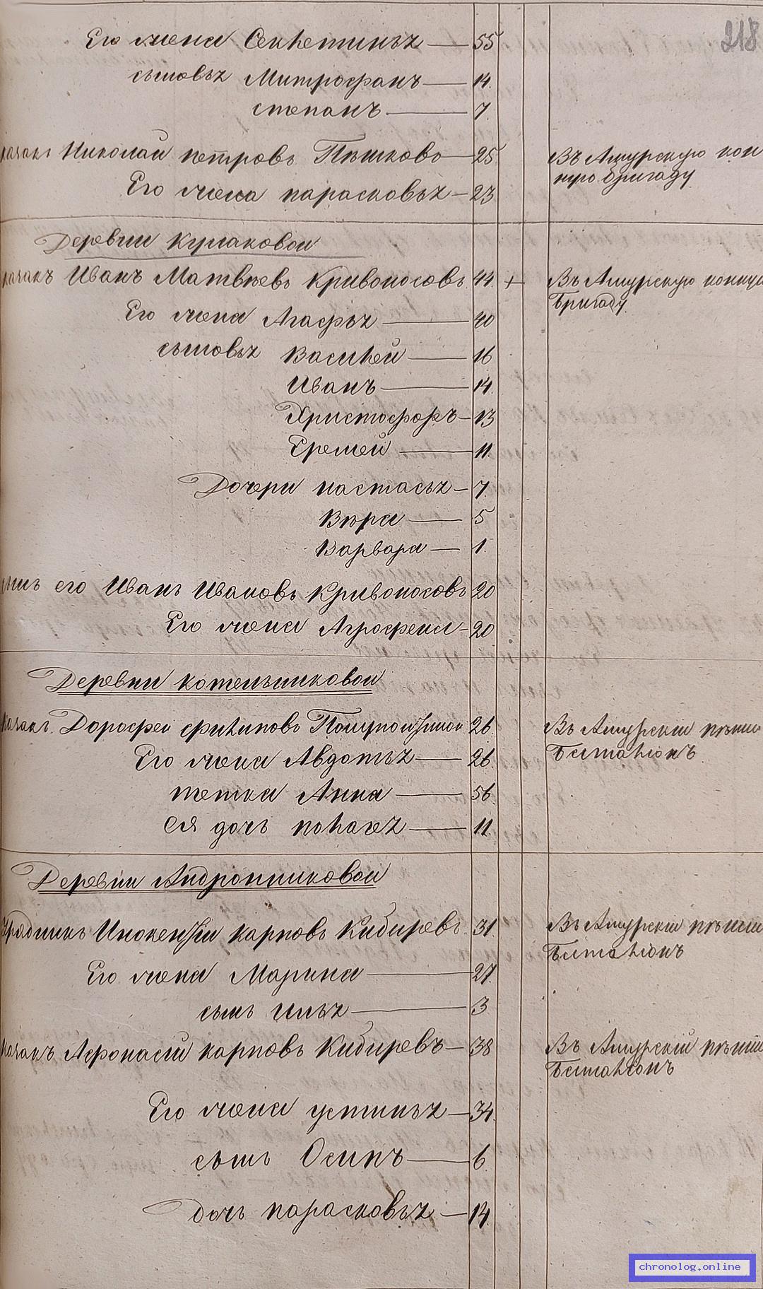 ГАЗК 30-2-270, Л.122об, 123, 142об, 251 (Посемейные списки переселенцев на р. Амур): Казак 12-го пешего батальона Руф Афонасьевич Добрынин 33 его жена Катерина 33 сыновья Иван 4 Степан 8 дочь Федосья 2. Исход: деревня Шокшинская Нерчинского уезда. Снимки: 122об, 123, 142об, 251. | |||