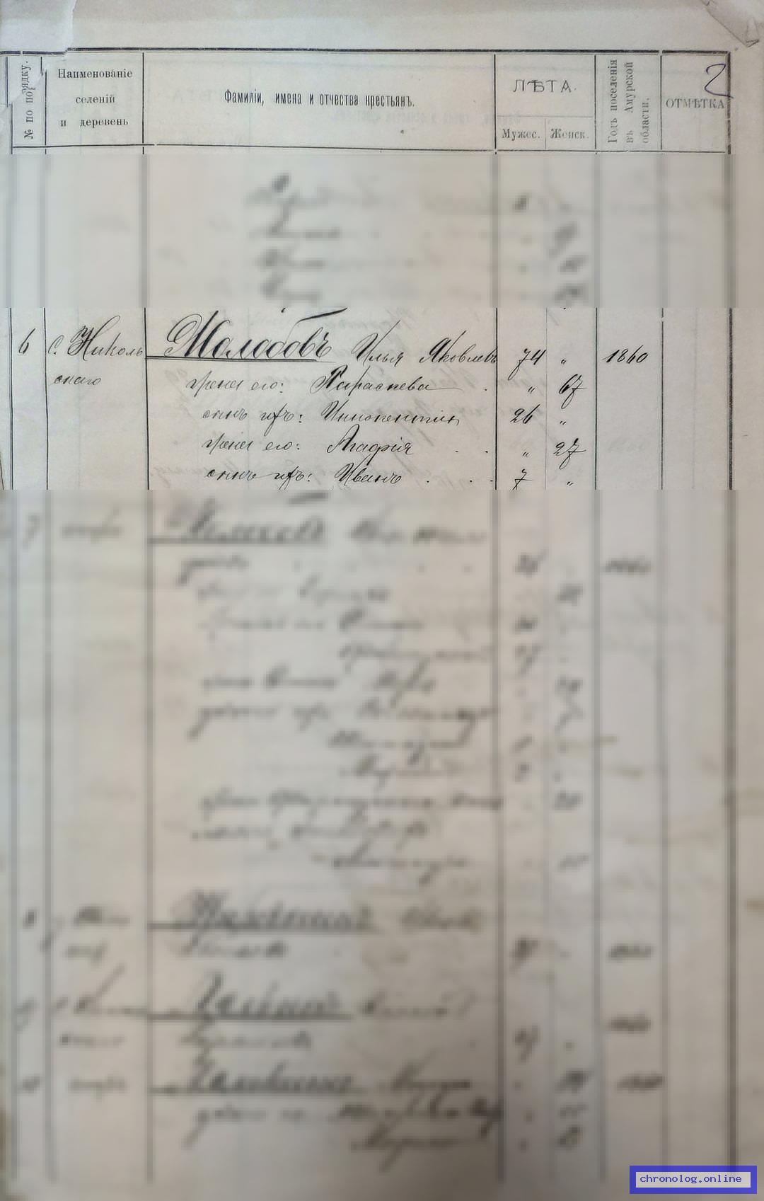 РГИАДВ 704-4-6107, Л.2 (Список крестьян Томской волости на 1900 год): Жолобов Илья Яковлевич 74 лет, жена его Параскева 67 лет. Сын их Иннокентий 26 лет, жена его Агафья [лета не показаны]. Сын их Иван 7 лет. Жительствуют в селе Никольском с 1860 года. Время и место исхода не показано. Снимки: 2. | |||