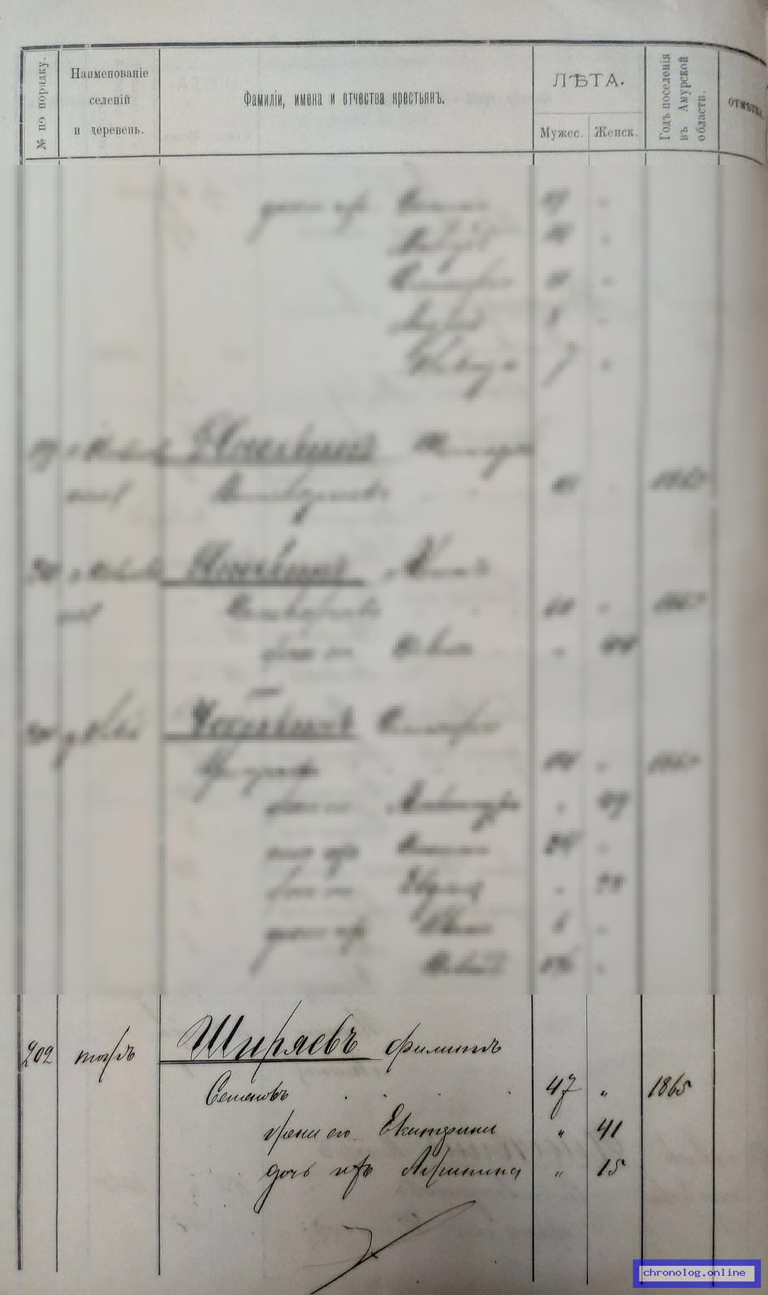 РГИАДВ 704-4-6107, Л.36 (Список крестьян Томской волости на 1900 год): Ширяев Иона Семёнович 45 лет, жена Акилина 43 лет. Дети их: Аким 27 лет, Агрипина 15 лет, Татьяна 12 лет, Елена 9 лет, Анна 4 года 7 месяцев. Жена Акима Параскева 25 лет. Дети их: Александра 4 лет 9 месяцев, Иван 2 года 4 месяца. Жительствуют в селе Васильевке с 1865 года. Время и место исхода не показано. Снимки: 36. | |||