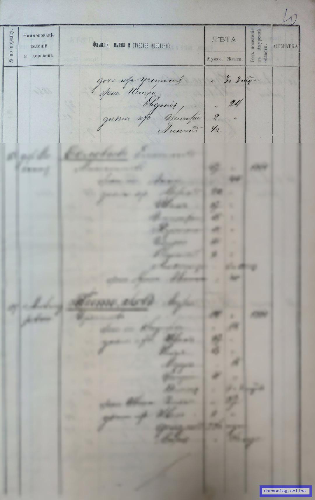 РГИАДВ 704-4-706, Л.49об (Списки переселенцев и сельских обществ Амурской области на 1897 год): Никитин Алексей Иванович 43 лет. Жена Аграфена Михайловна 43 лет, дети их: Яков 6 лет, Наталья 10 лет, Анна 8 лет. Время и место исхода не показано. Снимки: 49об. | |||