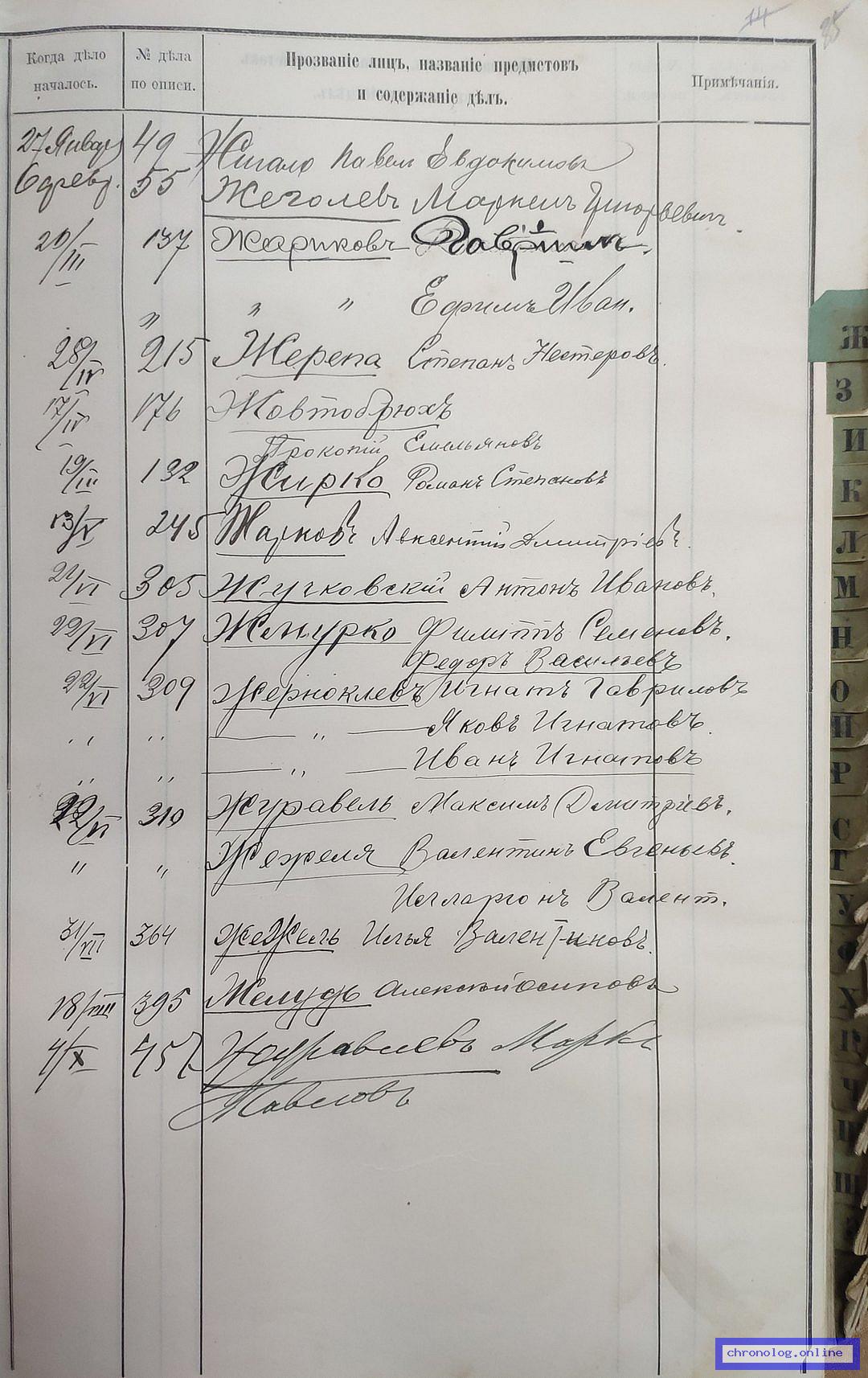 РГИАДВ 704-4-3230, Л.35 (Указатель дел переселенческой части за 1912 год): Жеголев Маркел Григориевич показан со ссылкой на дело (старая опись, нумерация не действительная) №55 от 6.2.1912. Время и место исхода не показано. Снимки: 35. | |||