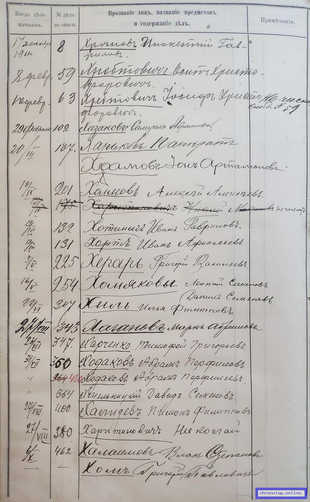РГИАДВ 704-4-3230, Л.165об (Указатель дел переселенческой части за 1912 год): Харченко Тимофей Григориевич показан со ссылкой на дело (старая опись, нумерация не действительная) №347 от 26.7.1912. Время и место исхода не показано. Снимки: 165об. | |||