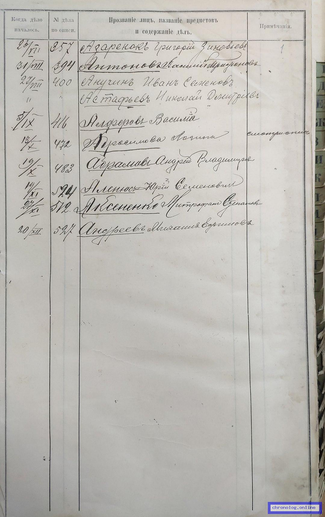 РГИАДВ 704-4-3230, Л.92 (Указатель дел переселенческой части за 1912 год): Осадчий Никифор Григориевич показан со ссылкой на дело (старая опись, нумерация не действительная) №165 от 17.4.1912. Время и место исхода не показано. Снимки: 92. | |||
