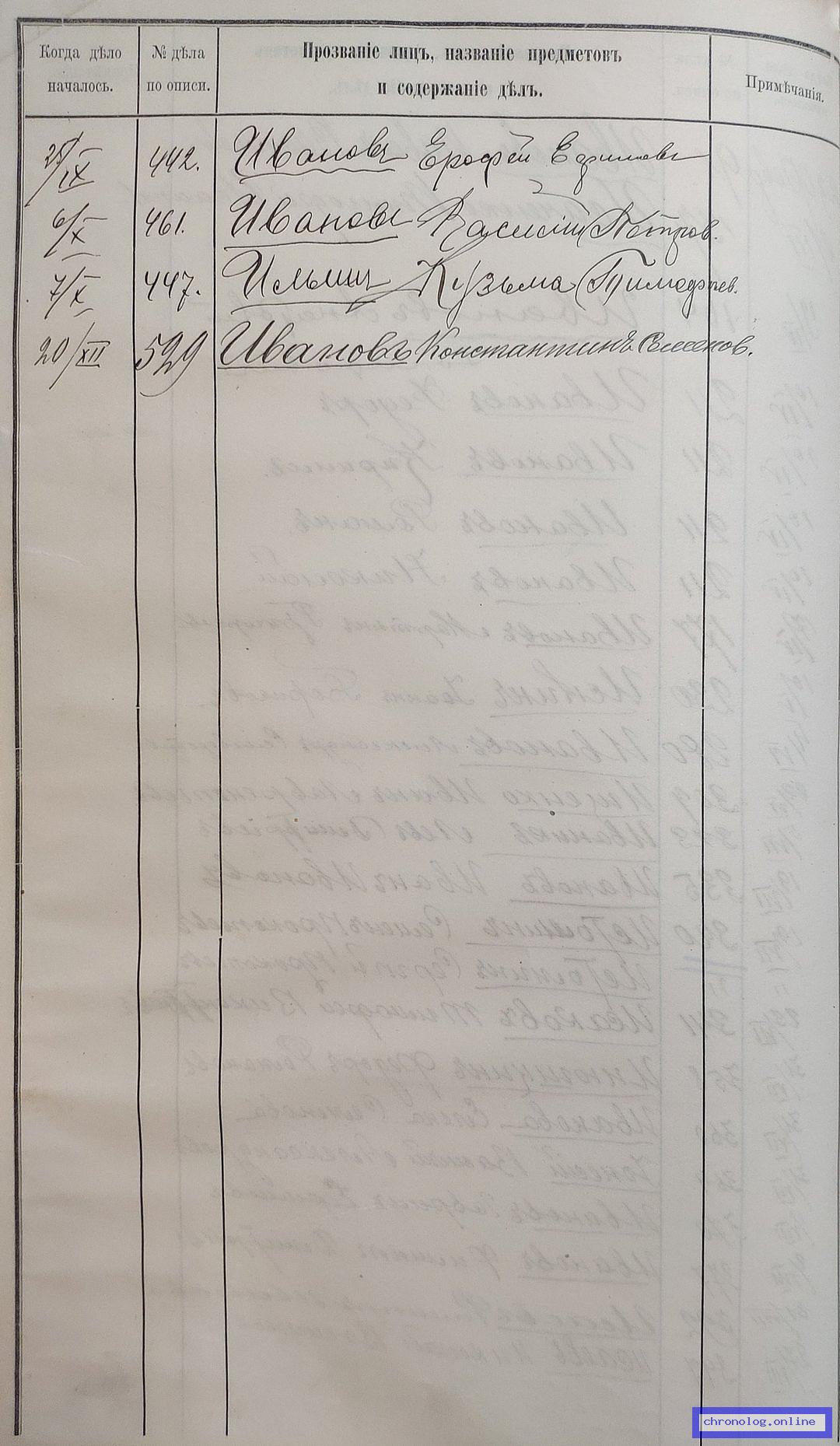 РГИАДВ 704-4-3230, Л.47об (Указатель дел переселенческой части за 1912 год): Иванов Константин Семёнович показан со ссылкой на дело (старая опись, нумерация не действительная) №529 от 20.12.1912. Время и место исхода не показано. Снимки: 47об. | |||