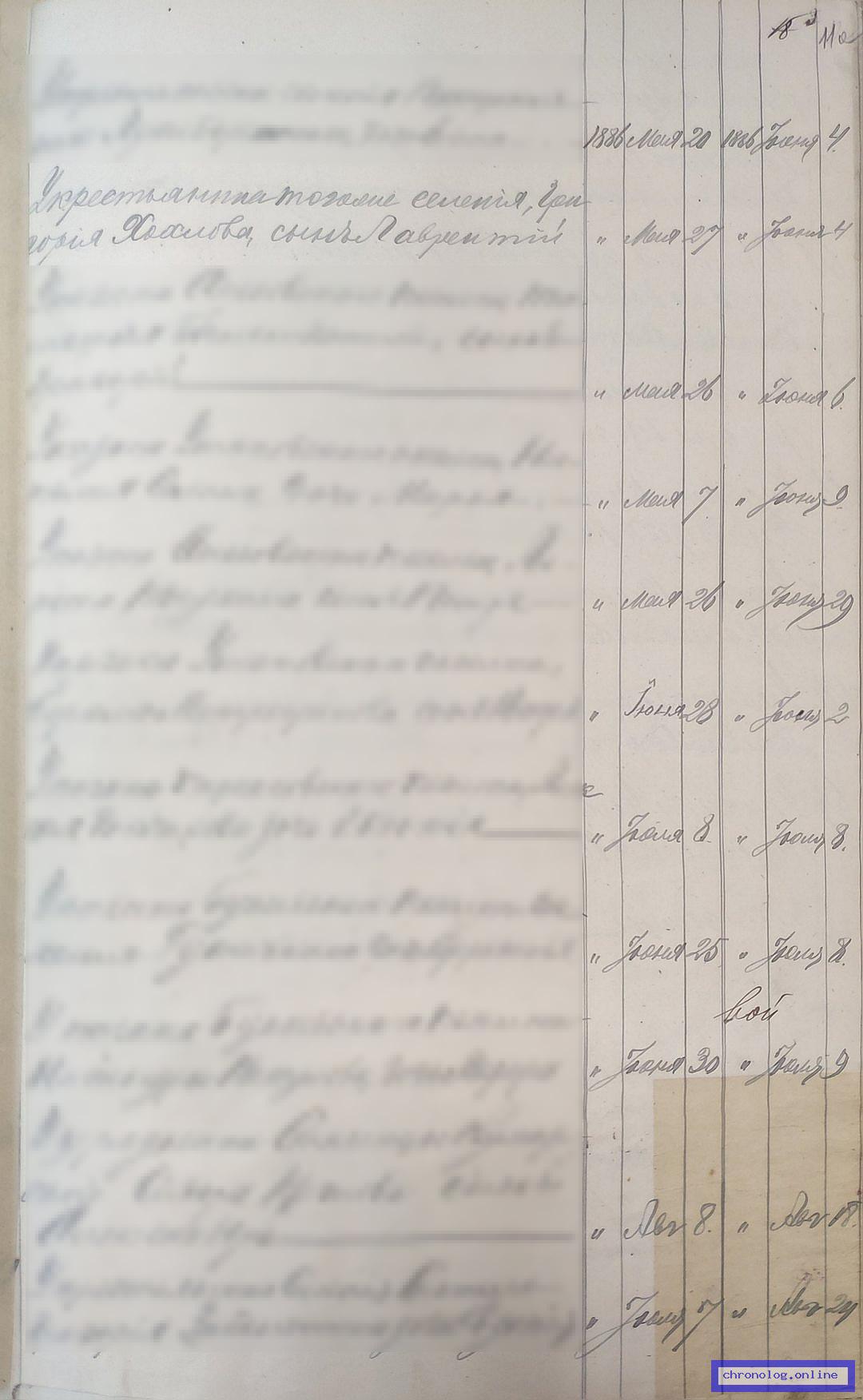 РГИАДВ 793-1-558, Л.11а (Метрические книги станичных округов Амурского казачьего войска на 1886 год): Запись №51. 27 мая рождён и 04 июня 1886 года крещён Лаврентий - сын крестьянина Григория Хохлова. Время и место исхода не показано. Снимки: 11а. | |||