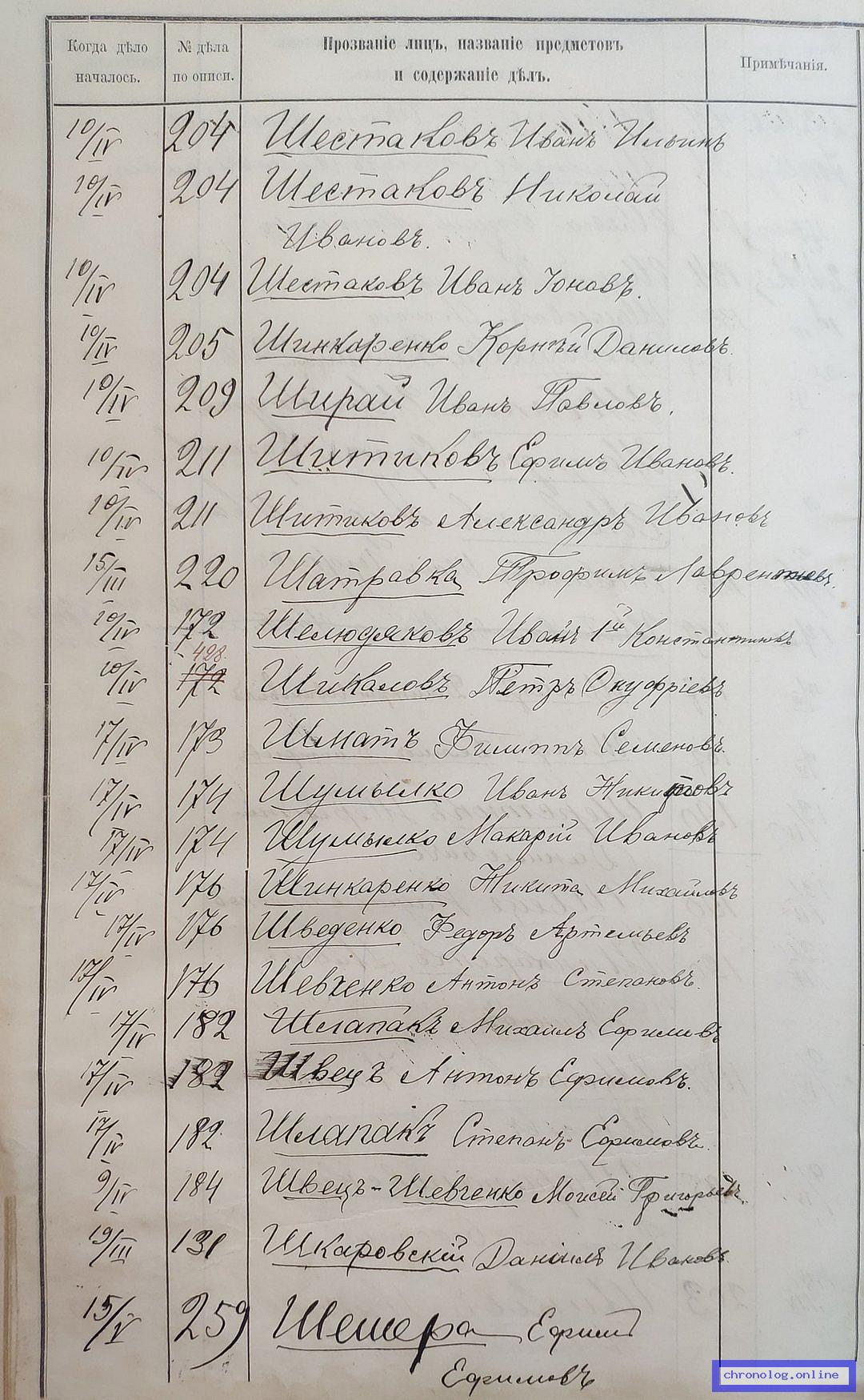 РГИАДВ 704-4-3230, Л.182об (Указатель дел переселенческой части за 1912 год): Шитиков Ефим Иванович показан со ссылкой на дело (старая опись, нумерация не действительная) №211 от 10.4.1912. Время и место исхода не показано. Снимки: 182об. | |||