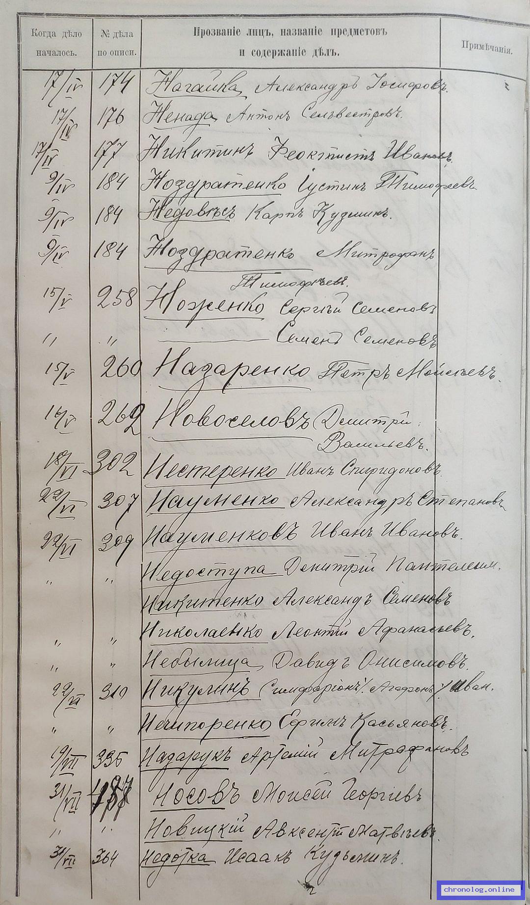 РГИАДВ 704-4-3230, Л.84об (Указатель дел переселенческой части за 1912 год): Назарук Арефий Тимофеевич показан со ссылкой на дело (старая опись, нумерация не действительная) №335 от 19.7.1912. Время и место исхода не показано. Снимки: 84об. | |||