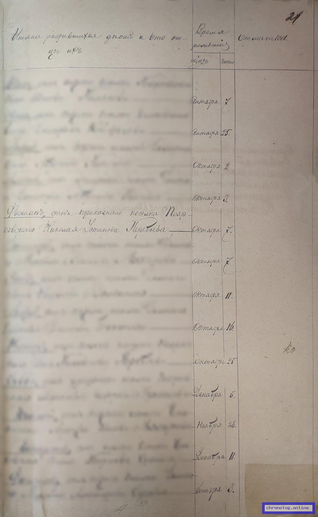 РГИАДВ 793-1-558, Л.21 (Метрические книги станичных округов Амурского казачьего войска на 1886 год): 7 октября 1886 года у приказного посёлка Поярковского родился сын Филипп, о чём была сделана запись в книге прихода Поярковской Богородице-Скорбящей церкви. Время и место исхода не показано. Снимки: 21. | |||