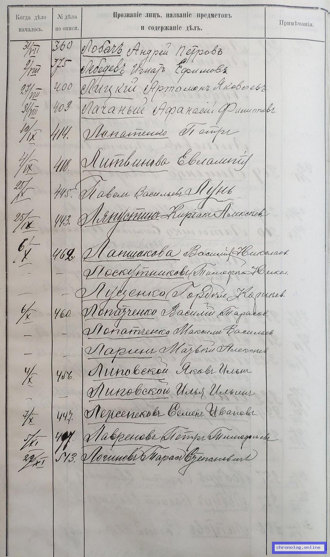 РГИАДВ 704-4-3230, Л.69об (Указатель дел переселенческой части за 1912 год): Лопатченко Василий Тарасович показан со ссылкой на дело (старая опись, нумерация не действительная) №460 от 6.10.1912. Время и место исхода не показано. Снимки: 69об. | |||