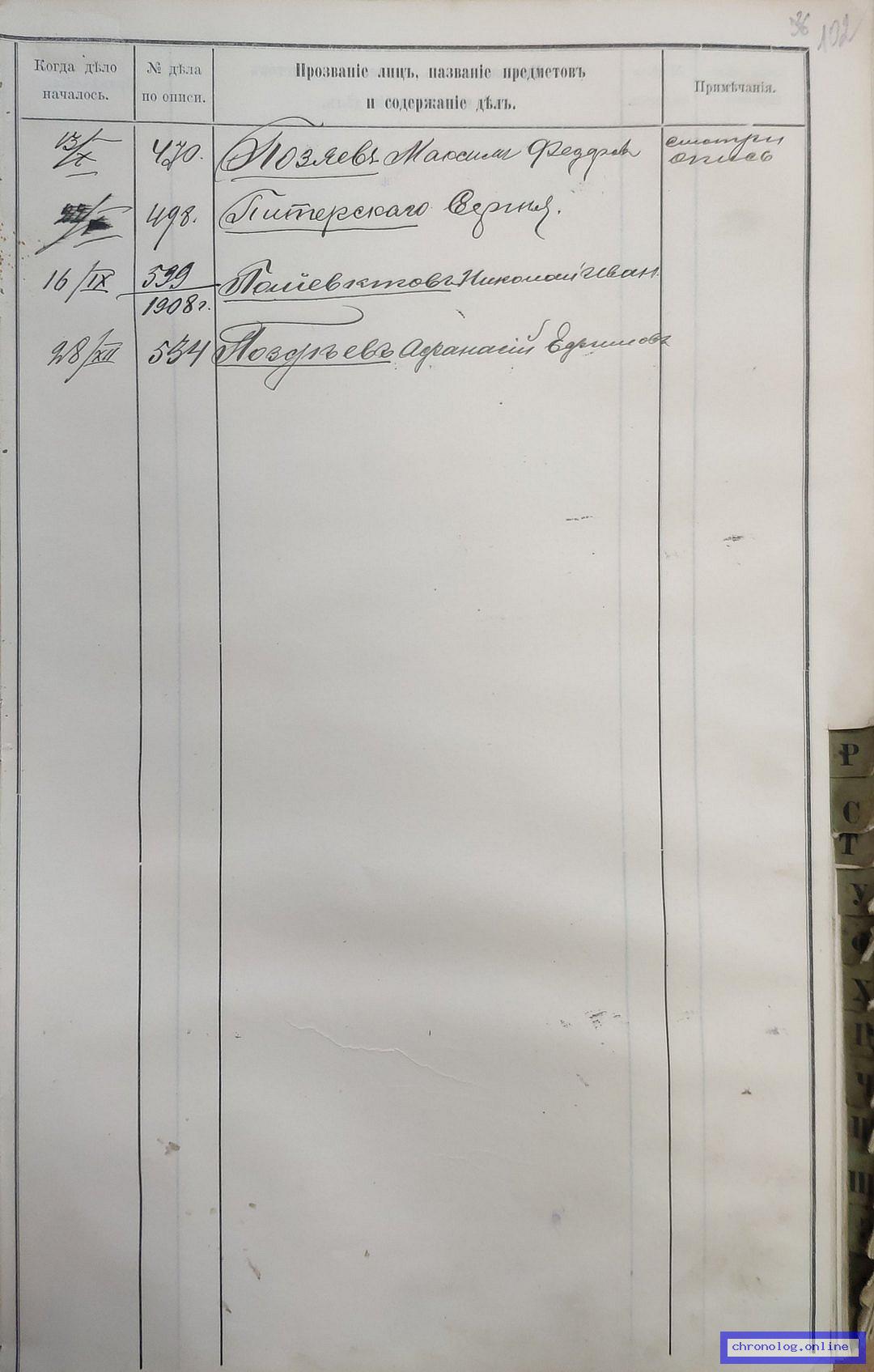 РГИАДВ 704-4-3230, Л.100об (Указатель дел переселенческой части за 1912 год): Пустовит Иван Андреевич показан со ссылкой на дело (старая опись, нумерация не действительная) №174 от 17.4.1912. Время и место исхода не показано. Снимки: 100об. | |||