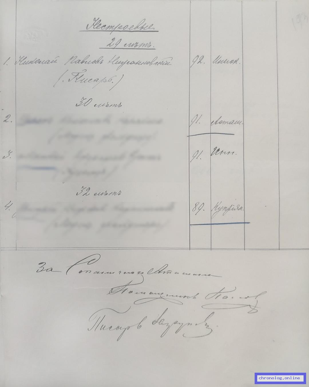 РГИАДВ 793-1-419, Л.193 (Списки казакам, вахмистрам, урядникам Амурского казачьего войска по возрастам, разрядам и округам на 1900 год): Писарь Николай Павлович Нижанковский 29 лет из посёлка Иннокеньтевского показан в списке по Иннокентьевскому станичному округу. Время и место исхода не показано. Снимки: 193. | |||