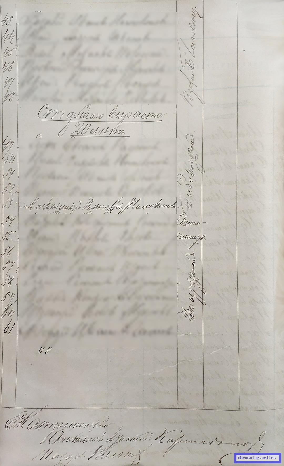 РГИАДВ 793-1-419, Л.117об (Списки казакам, вахмистрам, урядникам Амурского казачьего войска по возрастам, разрядам и округам на 1900 год): Казак приготовительного разряда Александр Григорьевич Номоконов 20 лет из посёлка Бибиковского показан в списке по Екатерининскому станичному округу. Время и место исхода не показано. Снимки: 117об. | |||