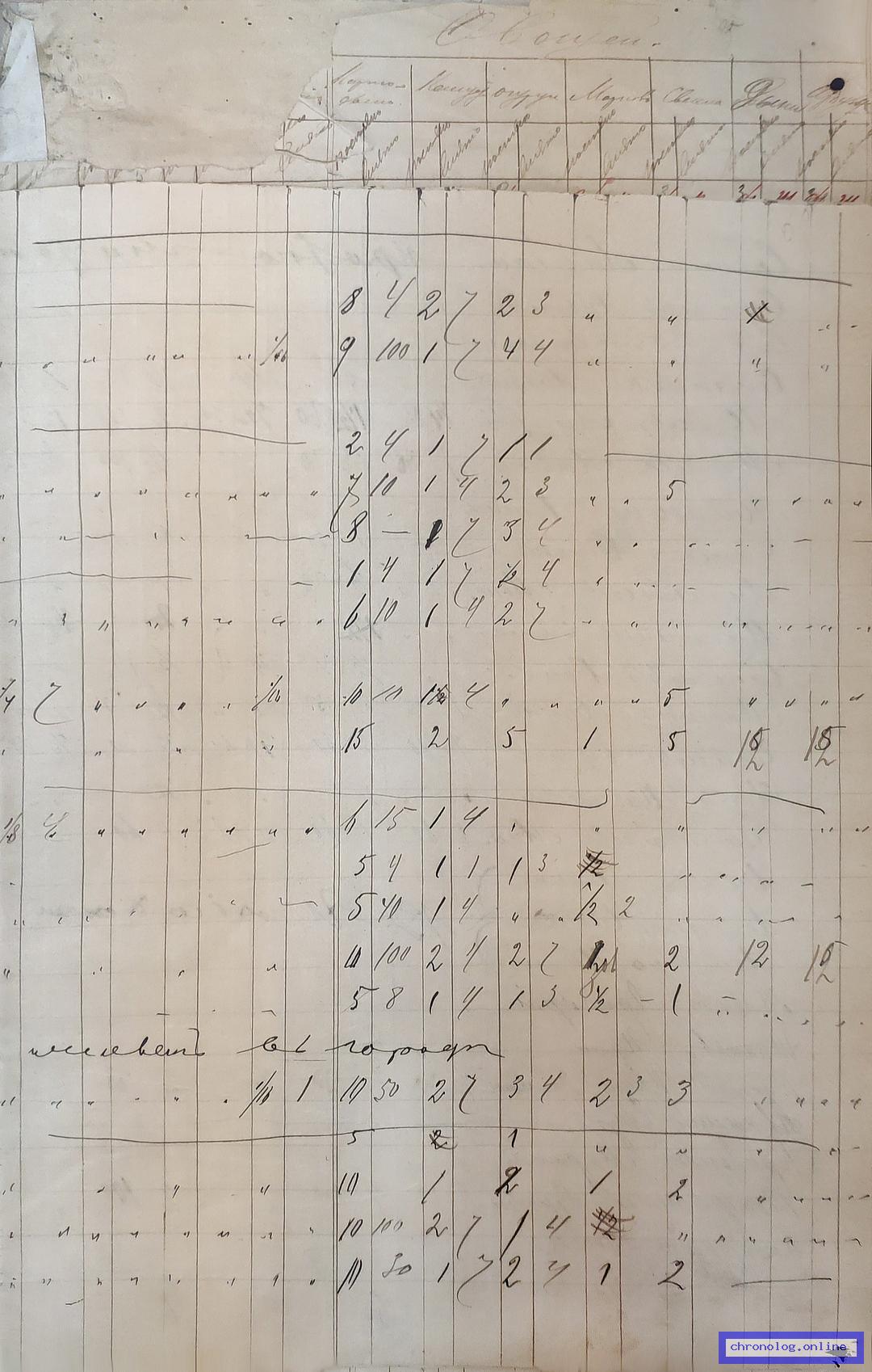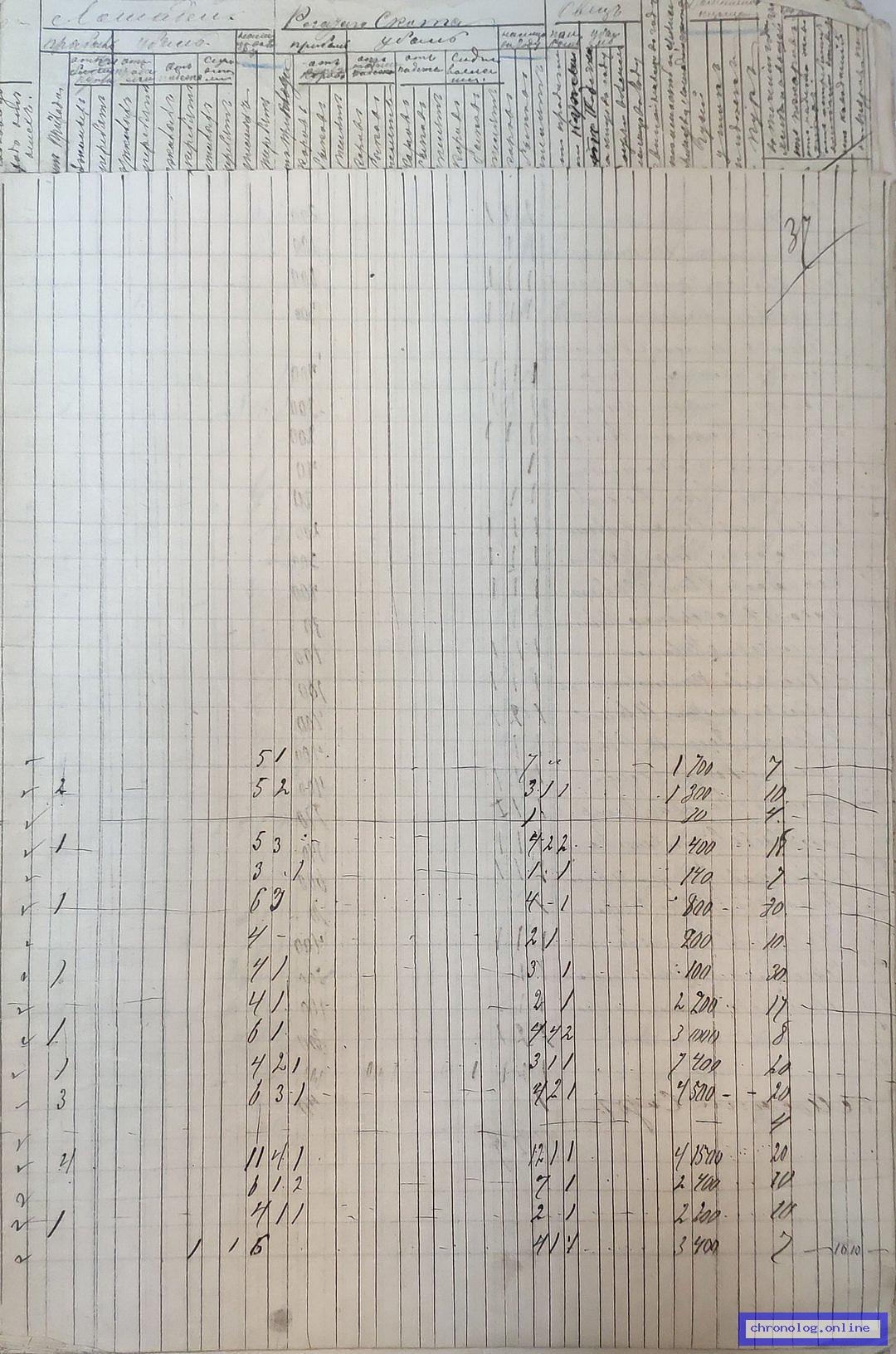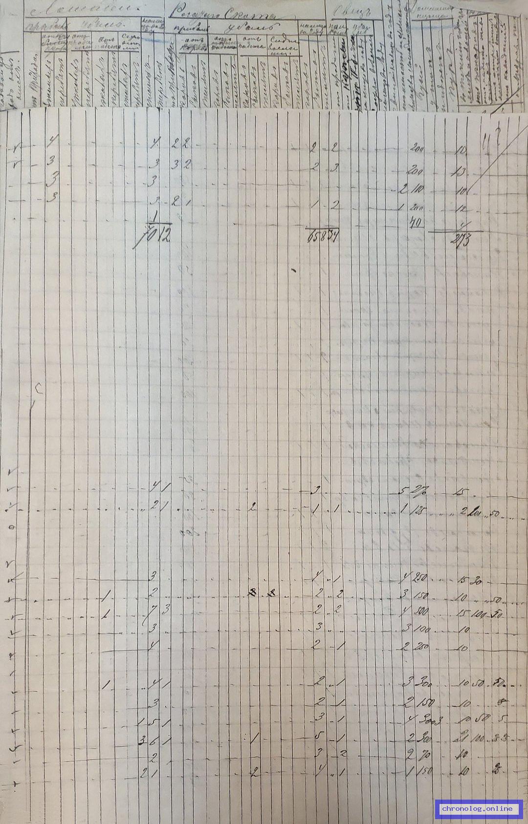 РГИАДВ 746-1-37, Л.8об., 9, 68об., 69 (Сведения о крестьянских селениях и посеве хлеба на 1896 год): Хозяйство Кондратенко Фёдора Моисеевича : 1 дом, 1 амбар, 1 баня на 300р., 1 лошадь, 4 коровы, 2 овцы на 200р.; посевы: ½ ярицы, 1½ пшеницы, 1 ячменя, ½ овса, 15 картофеля, 2 капусты, 5 огурцы, 1 моркови, 5 свеклы, 12 дынь, 12 арбузов. Время и место исхода не показано. Снимки: 8об, 9, 68об, 69. | |||