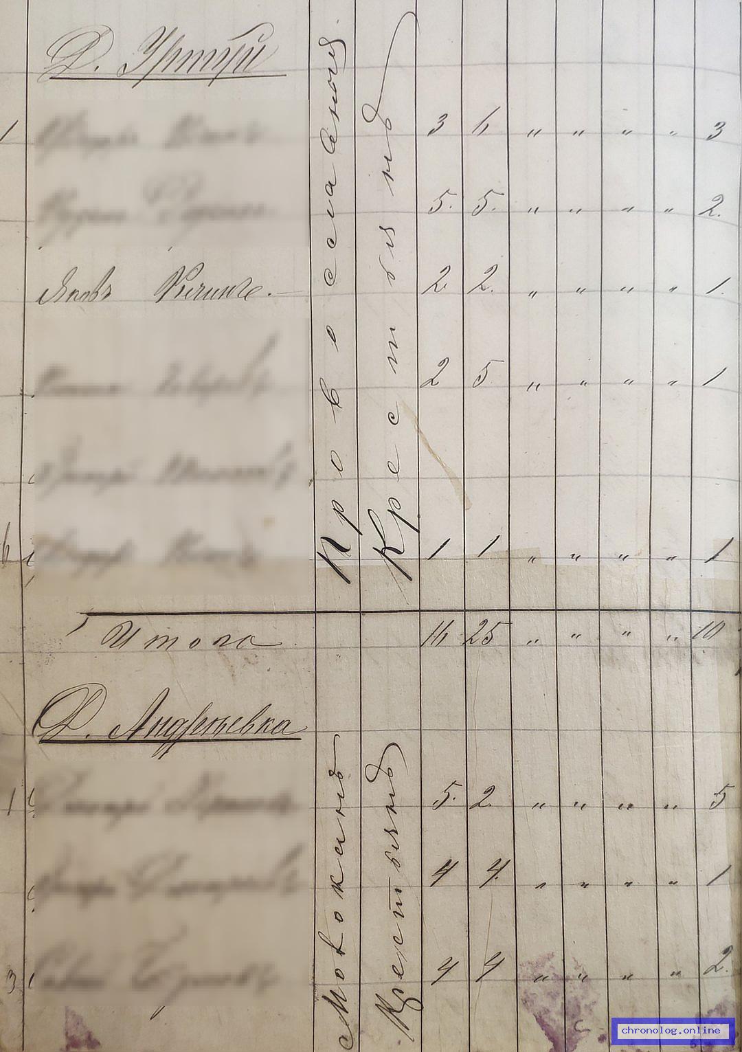 РГИАДВ 704-4-333, Л.8об., 9 (Список крестьян Ивановской волости на 1881 год): Кечин Яков из выселка Уртуй (Гильчинская волость) показан в статистической таблице с указанием числа мужчин и женщин в семье, количестве десятин обрабатываемой земли по данным на 1881 год. Время и место исхода не показано. Снимки: 8об, 9. | |||
