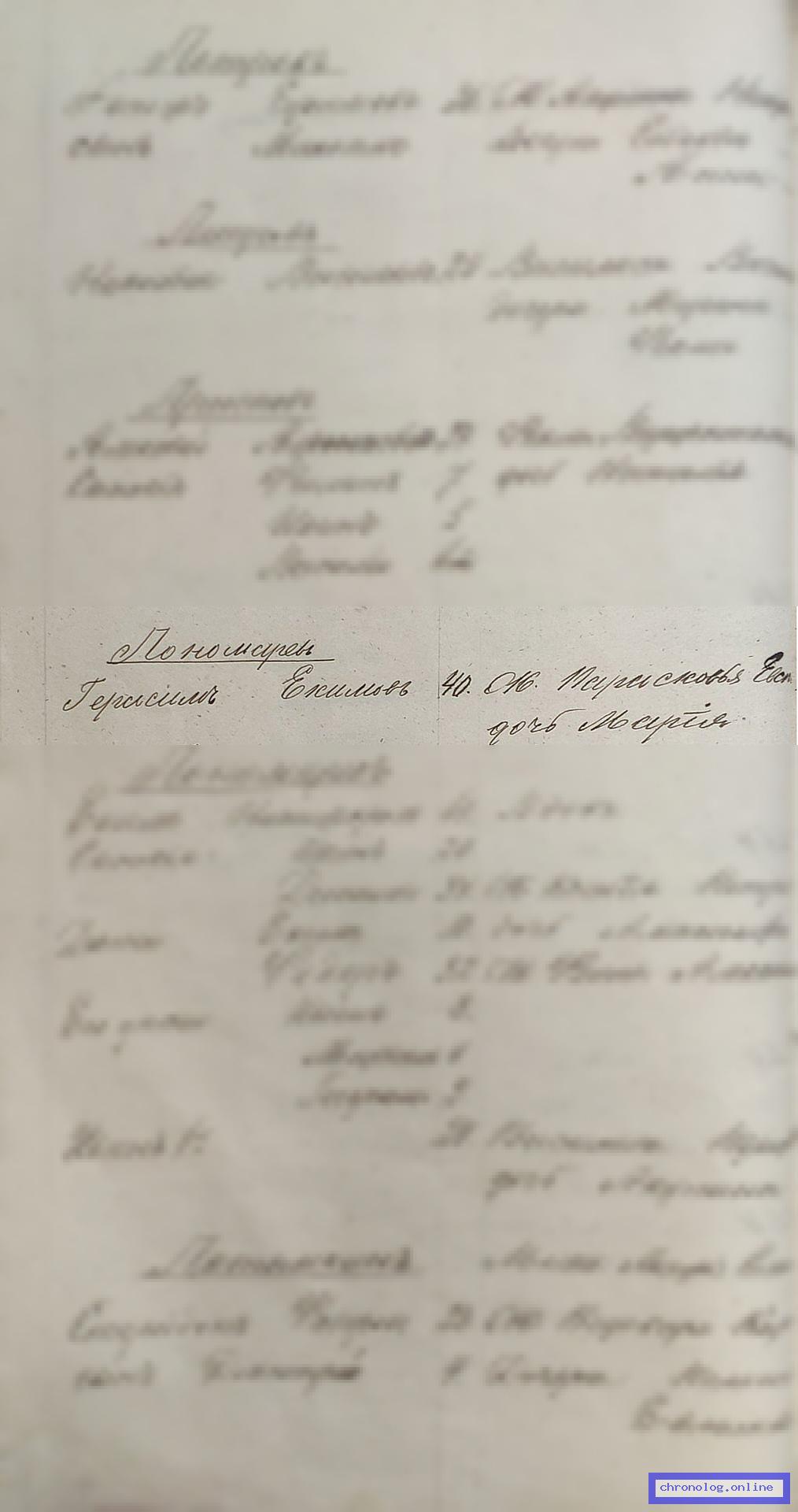 РГИАДВ 704-4-295, Л.25об., 26 (Список крестьян Ивановской волости на 1878 год): Крестьянин Пономарёв Герасим Екимович 40 лет, его жена Параскева Евсеевна 39 лет, у них дочь Мария 11 лет. Жительствуют в посёлке Ивановке с 1864 года. Время и место исхода не показано. Снимки: 25об, 26. | |||