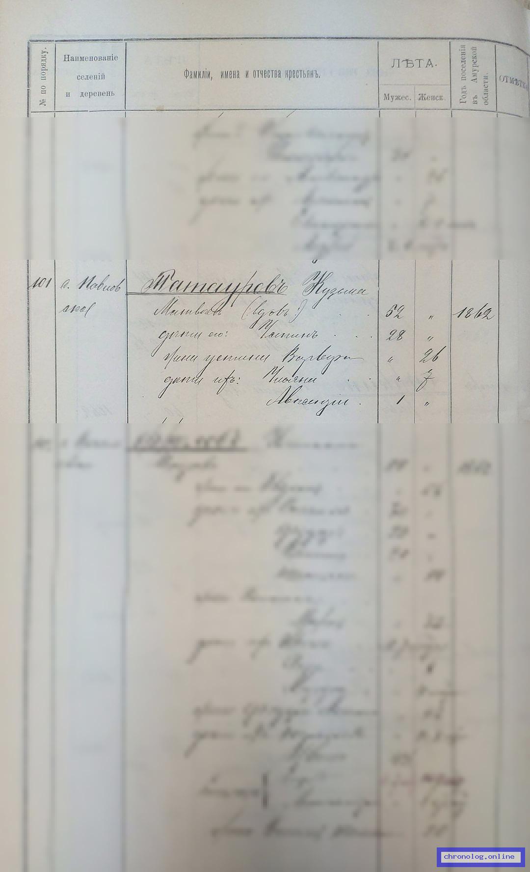 РГИАДВ 704-4-6107, Л.16об (Список крестьян Томской волости на 1900 год): Татауров Кузьма Матвеевич 52 лет, вдовец. Сын его Устин 28 лет, жена его Варвара 26 лет. Дети их: Ульяна 7 лет, Авксентий 1 лет. Жительствуют в селе Павловском с 1862 года. Время и место исхода не показано. Снимки: 16об. | |||
