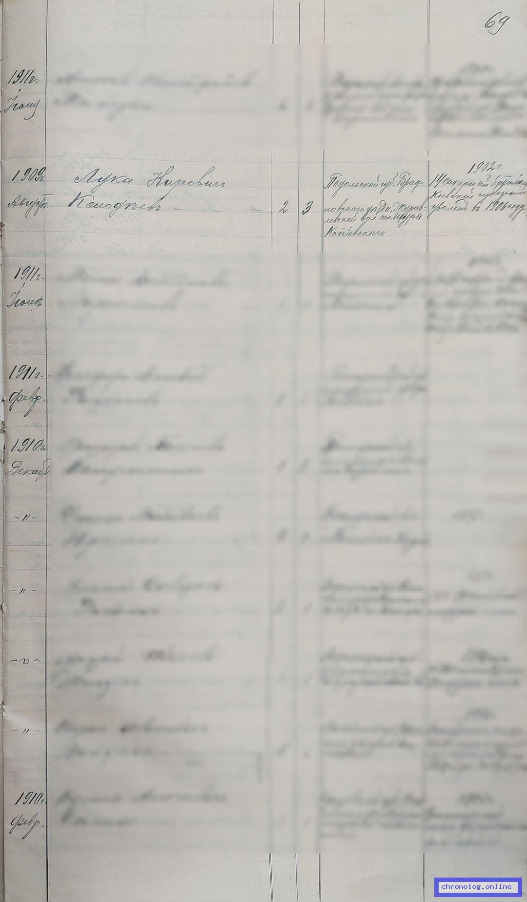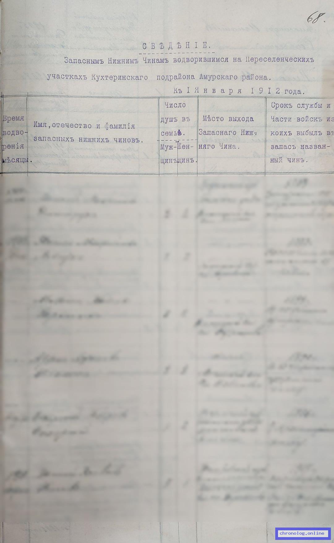 РГИАДВ 704-4-3228, Л.69 (Списки запасных солдат армии и флота, переселившихся в Амурскую область за 1912 год): Запасной нижний чин Лука Кирович Колодеев показан в таблице водворившихся на переселенческих участках Кухтеринского подрайона Амурского района. Исход: село Шуры Копиевского Журавлёвской волости Брацлавского уезда Подольской губернии. Снимки: 68, 69. | |||