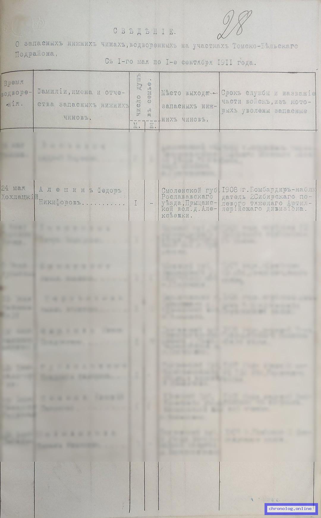 РГИАДВ 704-4-2690, Л.28 (Списки запасных солдат, причисленных в Амурскую область за 1911 год): В сводной таблице о запасных нижних чинах, водворённых на участки Томско-Бельского подрайона, показан Фёдор Никифорович Алешин. Исход: деревня Алексеевка Прыщанской волости Рославовского уезда Смоленской губернии. Снимки: 28. | |||