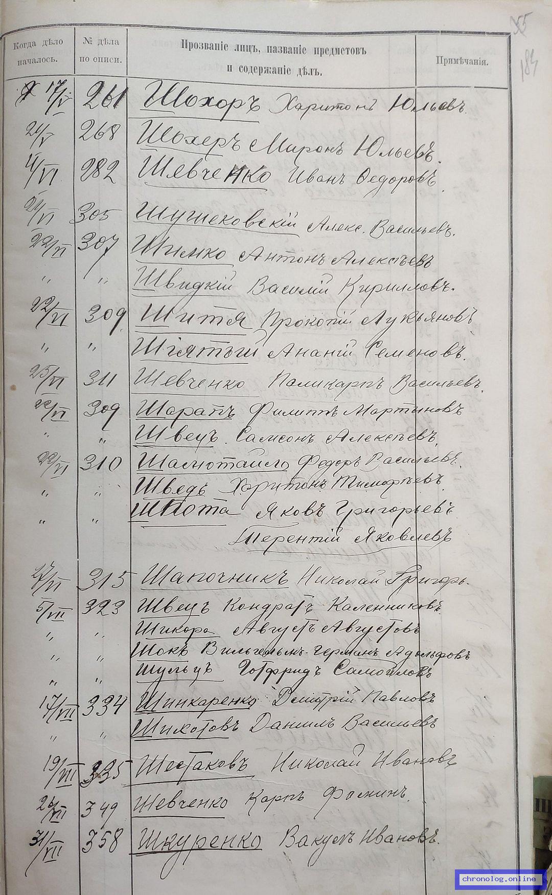 РГИАДВ 704-4-3230, Л.183об (Указатель дел переселенческой части за 1912 год): Шешера Михаил показан со ссылкой на дело (старая опись, нумерация не действительная) №433 от 2.10.1912. Время и место исхода не показано. Снимки: 183об. | |||