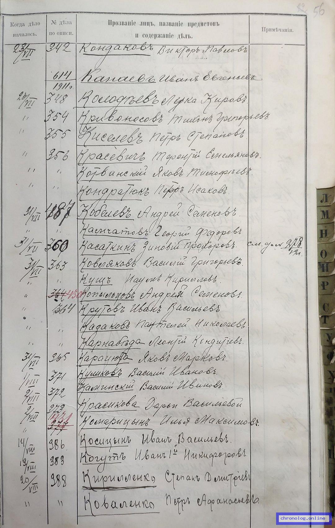 РГИАДВ 704-4-3230, Л.56 (Указатель дел переселенческой части за 1912 год): Кондаков Виктор Павлович показан со ссылкой на дело (старая опись, нумерация не действительная) №342 от 23.7.1912. Время и место исхода не показано. Снимки: 56. | |||