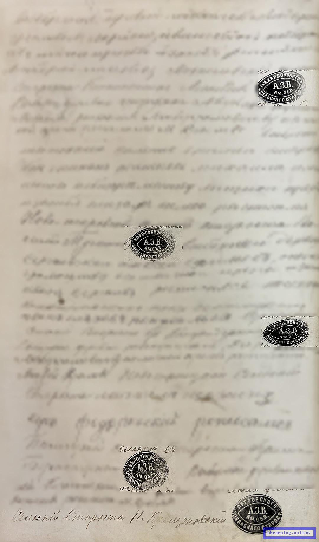 РГИАДВ 704-4-471, Л.21об (Постановления крестьянских сходов об утверждении в должностях за 1887 год): Показан участником и подписантом волостной старшина Николай Крещеновский. Время и место исхода не показано. Снимки: 21об. | |||