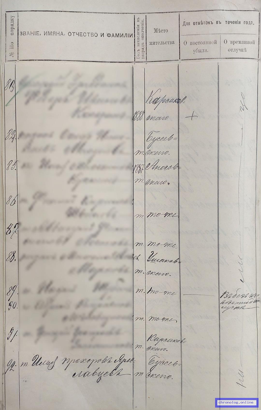 РГИАДВ 793-1-419, Л.101об (Списки казакам, вахмистрам, урядникам Амурского казачьего войска по возрастам, разрядам и округам на 1900 год): Казак Кумарского станичного округа посёлка Буссевского Илья Прохорович Ярославцев, зачисленный в ополчение. Время и место исхода не показано. Снимки: 101об. | |||