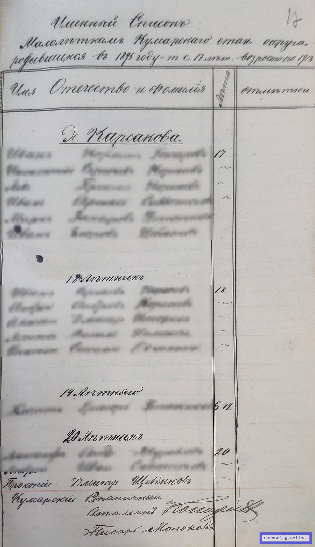 РГИАДВ 1591-1-3, Л.17 (Список казакам и урядникам Кумарского станичного округа на 1913 год): Щербенков Прокоп Дмитриевич 20 лет показан в списке малолеткам хутора Корсакова. Время и место исхода не показано. Снимки: 17. | |||