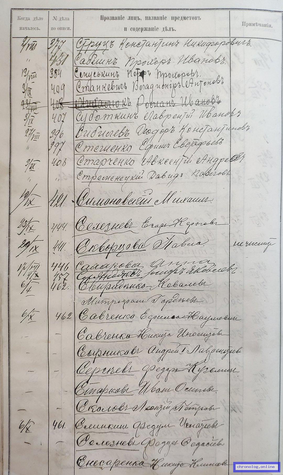 РГИАДВ 704-4-3230, Л.130об (Указатель дел переселенческой части за 1912 год): Старченко Авксент Андреевич показан со ссылкой на дело (старая опись, нумерация не действительная) №406 от 3.9.1912. Время и место исхода не показано. Снимки: 130об. | |||