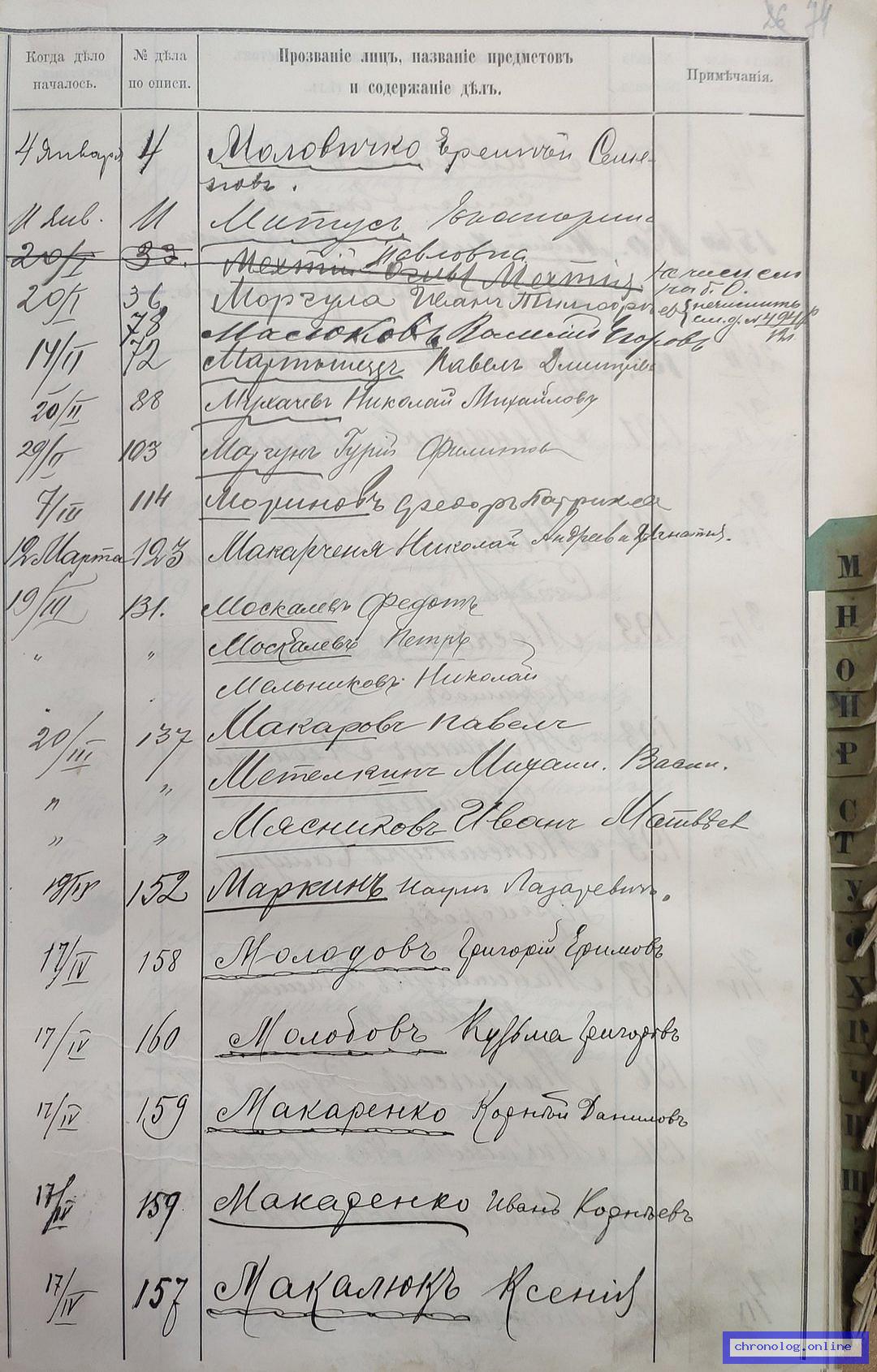 РГИАДВ 704-4-3230, Л.74 (Указатель дел переселенческой части за 1912 год): Молодов Кузьма Григориевич показан со ссылкой на дело (старая опись, нумерация не действительная) №160 от 17.4.1912. Время и место исхода не показано. Снимки: 74. | |||