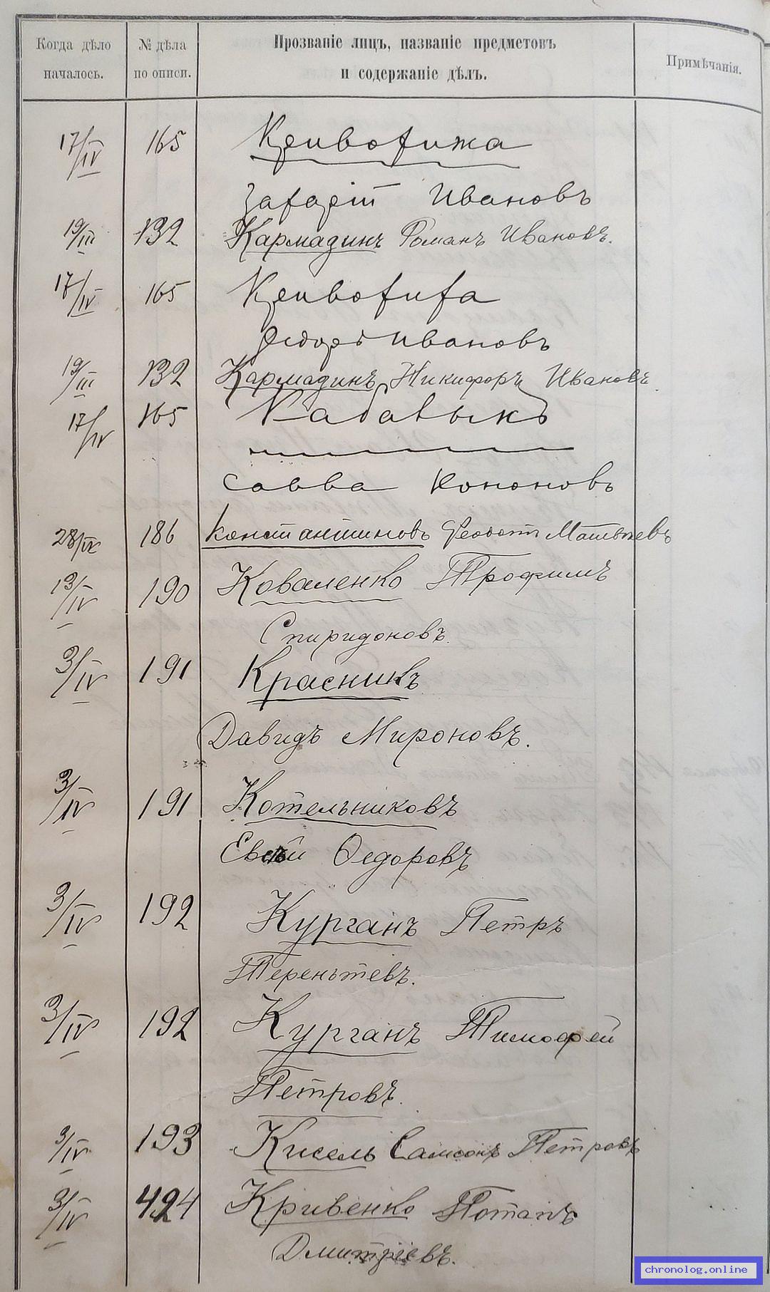 РГИАДВ 704-4-3230, Л.52об (Указатель дел переселенческой части за 1912 год): Кривохижа Захарий Иванович показан со ссылкой на дело (старая опись, нумерация не действительная) №165 от 17.4.1912. Время и место исхода не показано. Снимки: 52об. | |||