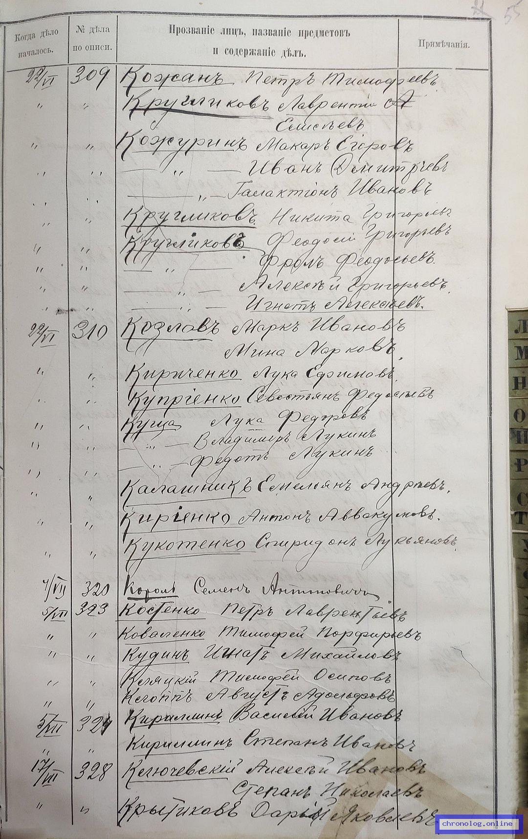 РГИАДВ 704-4-3230, Л.25об (Указатель дел переселенческой части за 1912 год): Дзей Кирилл Никифорович показан со ссылкой на дело (старая опись, нумерация не действительная) №309 от 22.6.1912. Время и место исхода не показано. Снимки: 25об. | |||