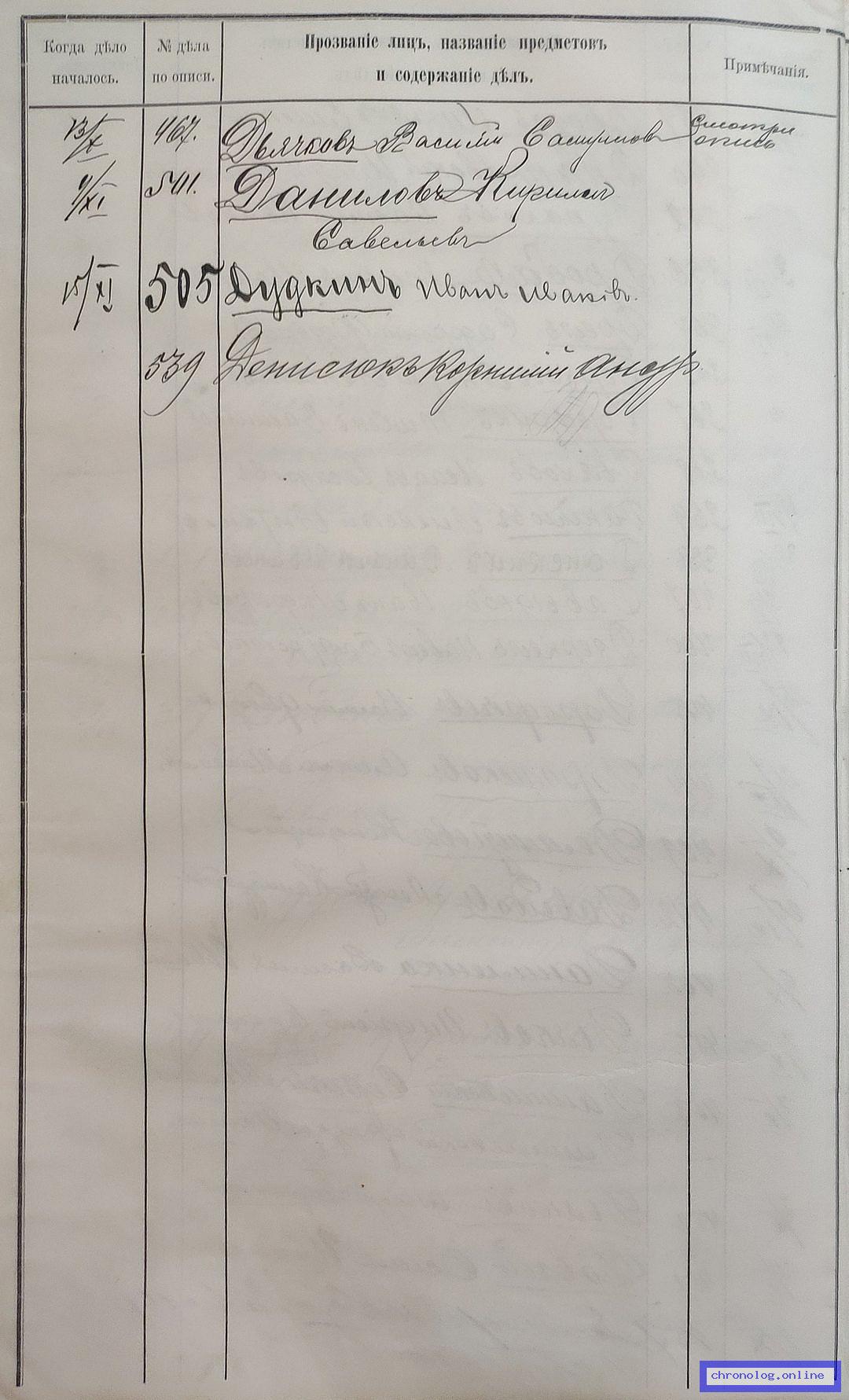 РГИАДВ 704-4-3230, Л.26об (Указатель дел переселенческой части за 1912 год): Дудкин Иван Иванович показан со ссылкой на дело (старая опись, нумерация не действительная) №505 от 15.11.1912. Время и место исхода не показано. Снимки: 26об. | |||