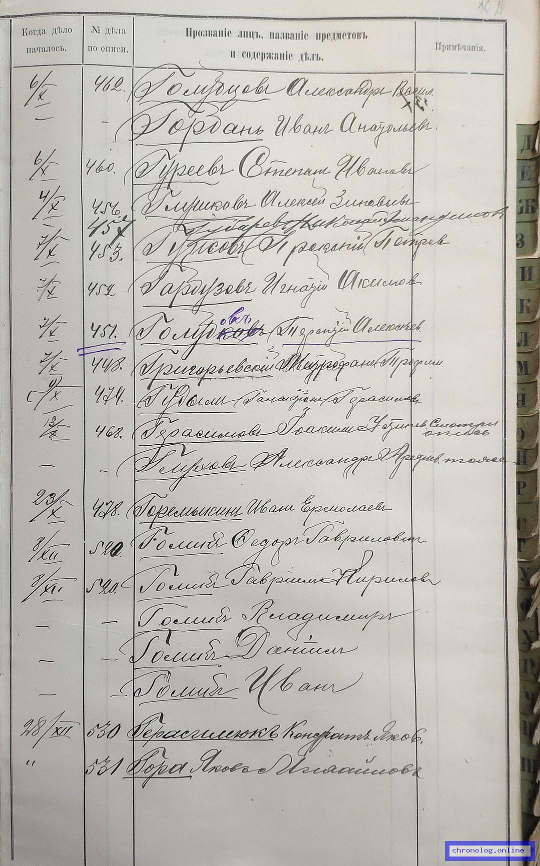 РГИАДВ 704-4-3230, Л.21 (Указатель дел переселенческой части за 1912 год): Губарев Николай Никадимович показан со ссылкой на дело (старая опись, нумерация не действительная) №457 от 4.10.1912. Время и место исхода не показано. Снимки: 21. | |||