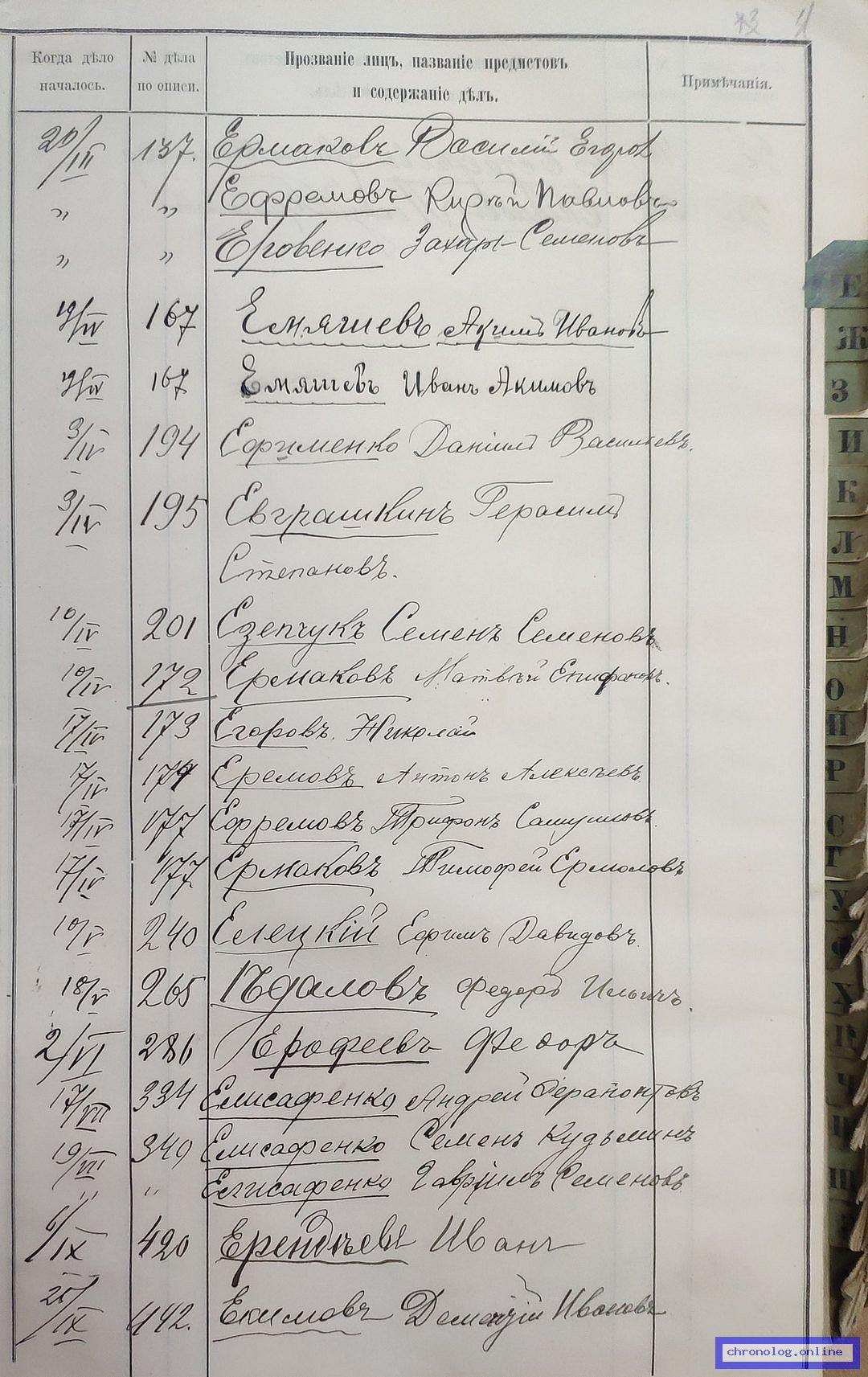 РГИАДВ 704-4-3230, Л.31 (Указатель дел переселенческой части за 1912 год): Ерофеев Фёдор показан со ссылкой на дело (старая опись, нумерация не действительная) №286 от 2.6.1912. Время и место исхода не показано. Снимки: 31. | |||