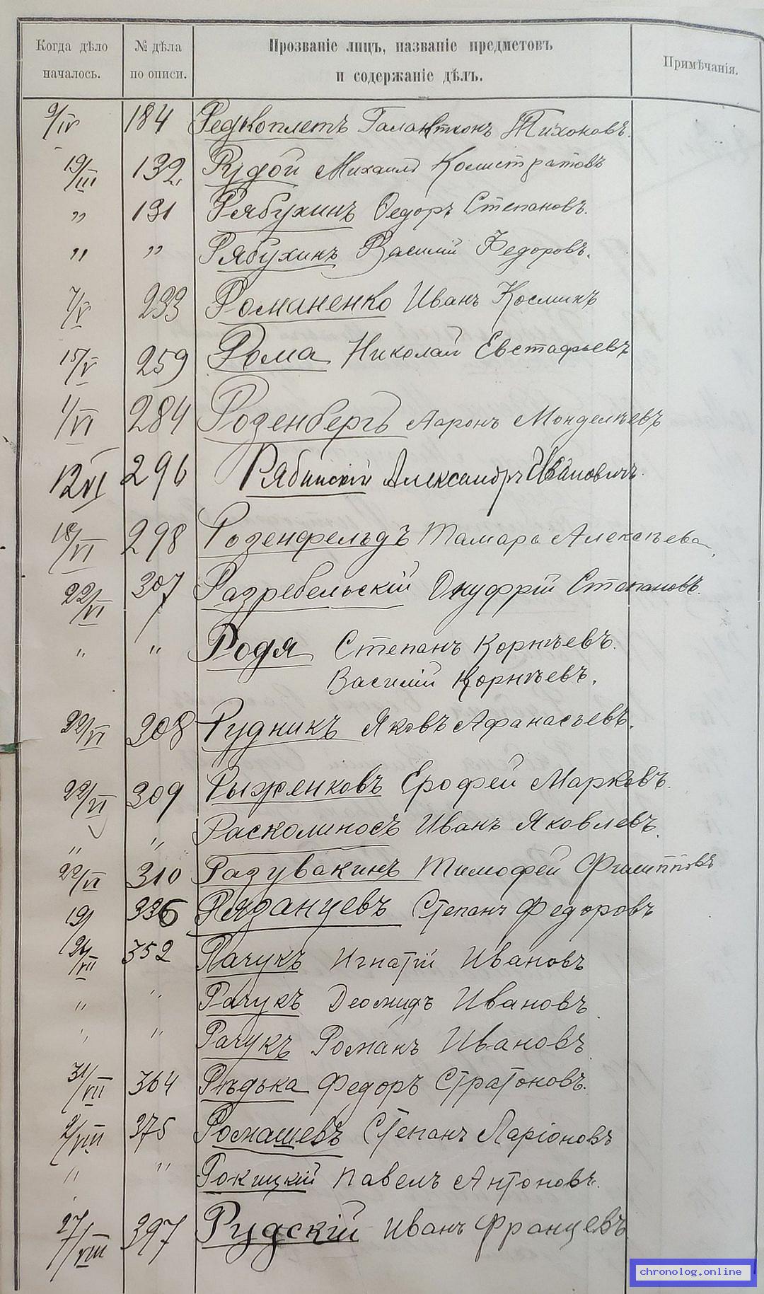 РГИАДВ 704-4-3230, Л.120об (Указатель дел переселенческой части за 1912 год): Рябухин Василий Фёдорович показан со ссылкой на дело (старая опись, нумерация не действительная) №131 от 19.3.1912. Время и место исхода не показано. Снимки: 120об. | |||