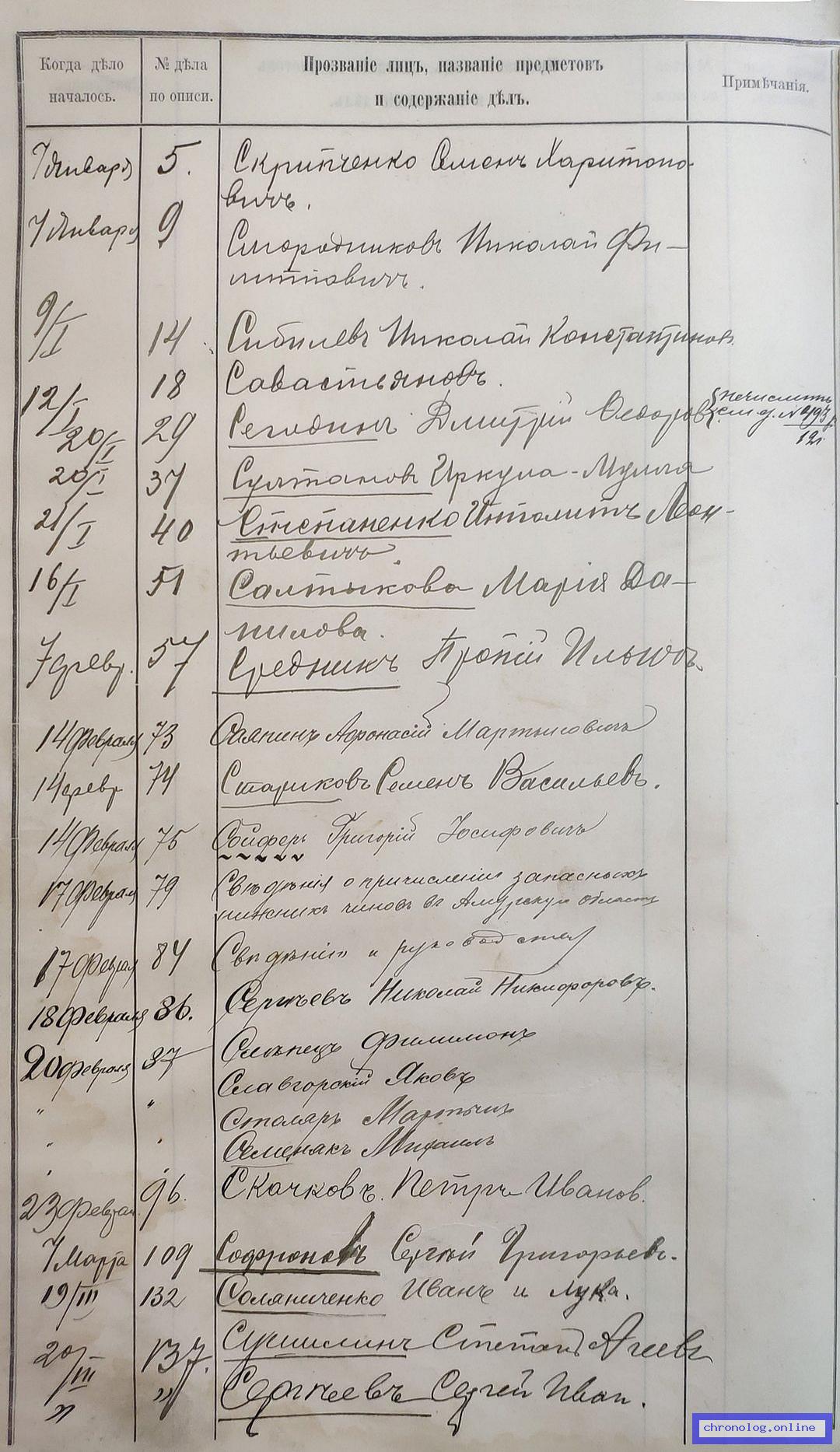РГИАДВ 704-4-3230, Л.130 (Указатель дел переселенческой части за 1912 год): Семенчиков Афанасий Лукьянович показан со ссылкой на дело (старая опись, нумерация не действительная) №341 от 23.7.1912. Время и место исхода не показано. Снимки: 130. | |||