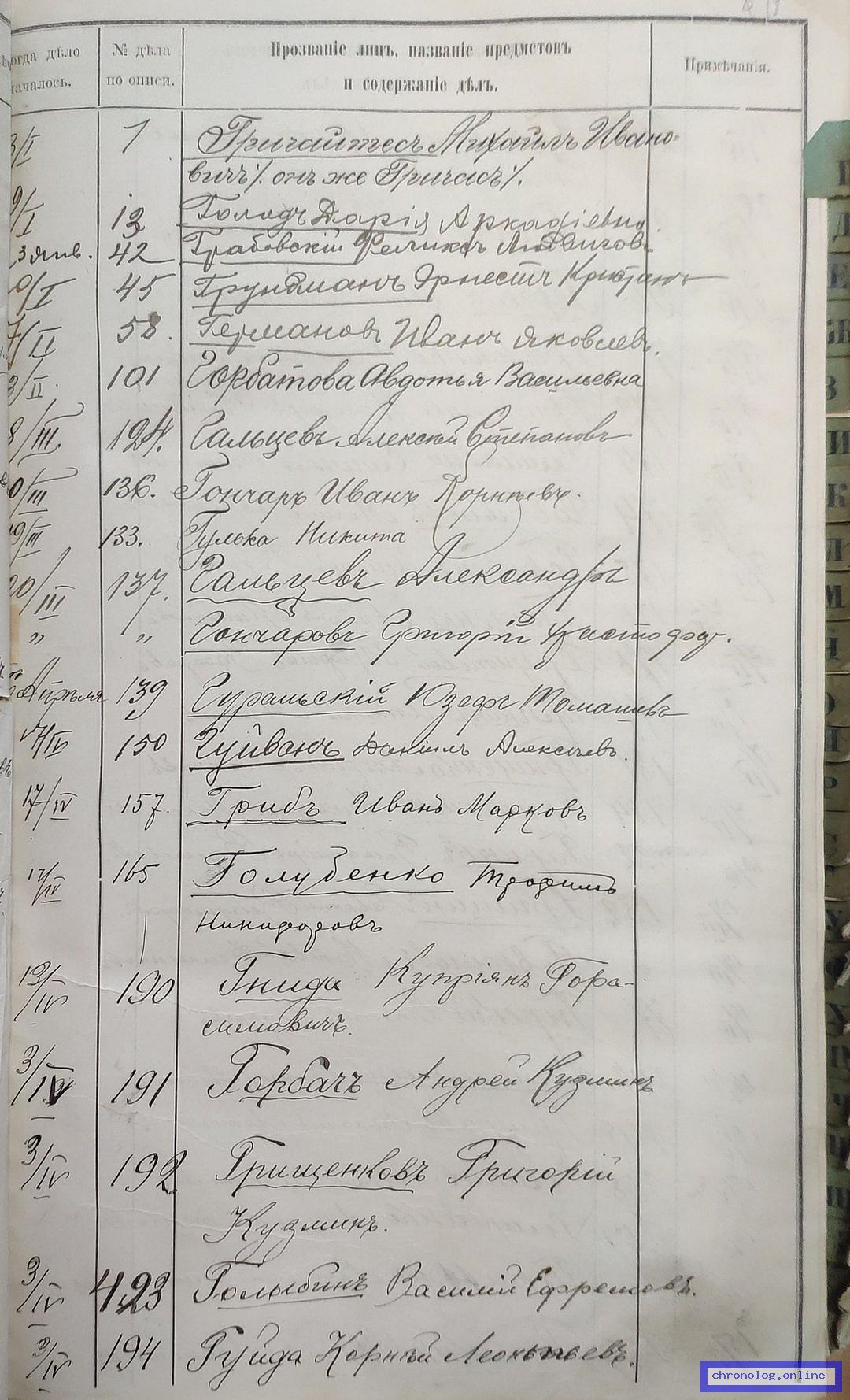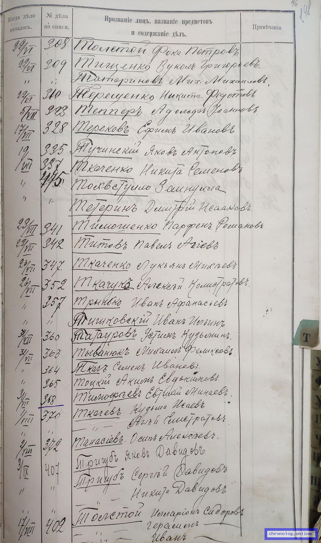 РГИАДВ 704-4-3230, Л.84об (Указатель дел переселенческой части за 1912 год): Науменко Александр Степанович показан со ссылкой на дело (старая опись, нумерация не действительная) №307 от 22.6.1912. Время и место исхода не показано. Снимки: 84об. | |||