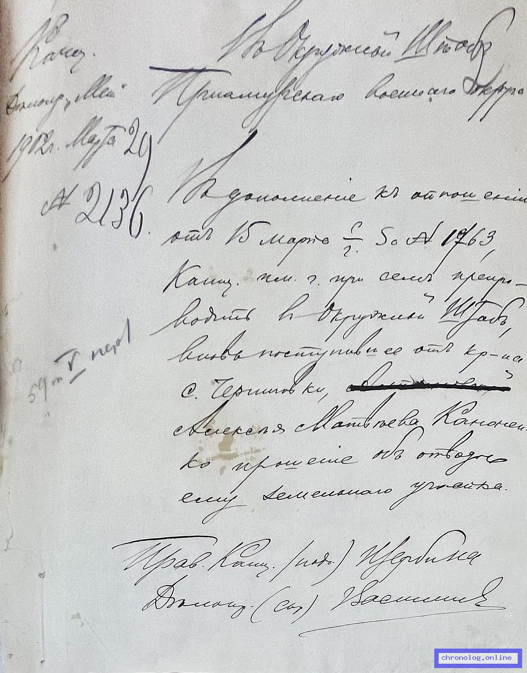 РГИАДВ 704-4-3230, Л.52об (Указатель дел переселенческой части за 1912 год): Кривенко Потап Дмитриевич показан со ссылкой на дело (старая опись, нумерация не действительная) №424 [зачёркнуто 194] от 3.4.1912. Время и место исхода не показано. Снимки: 52об. | |||