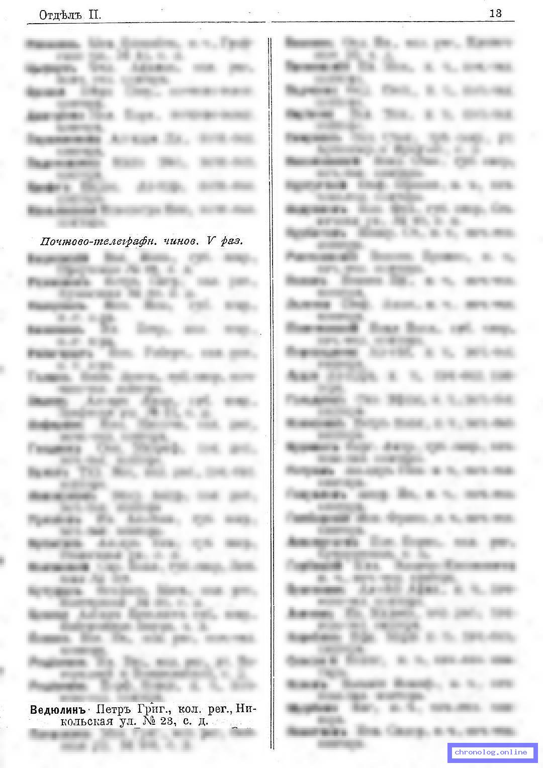 Разное СИ-АО-1915, стр.13 (Памятная книжка и адрес-календарь Амурской области на 1915 год): Благовещенская почтово-телеграфная контора. Почтово-телеграфный чиновник V разряда Ведюлин Пётр Григорьевич, коллежский регистратор, проживающий в собственном доме № 23 по улице Никольской. Время и место исхода не показано. Снимки: 13. | |||