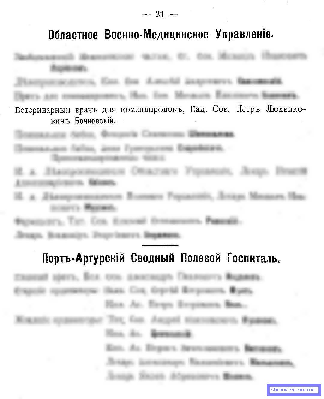 Разное СИ-КО-1901, стр.21 (Памятная книжка и адрес-календарь Квантунской области на 1901-1902 год): Надворный советник Пётр Людвикович Бочковский - ветеринарный врач для командировок при областном военно-медицинском Управлении. Время и место исхода не показано. Снимки: 21. | |||