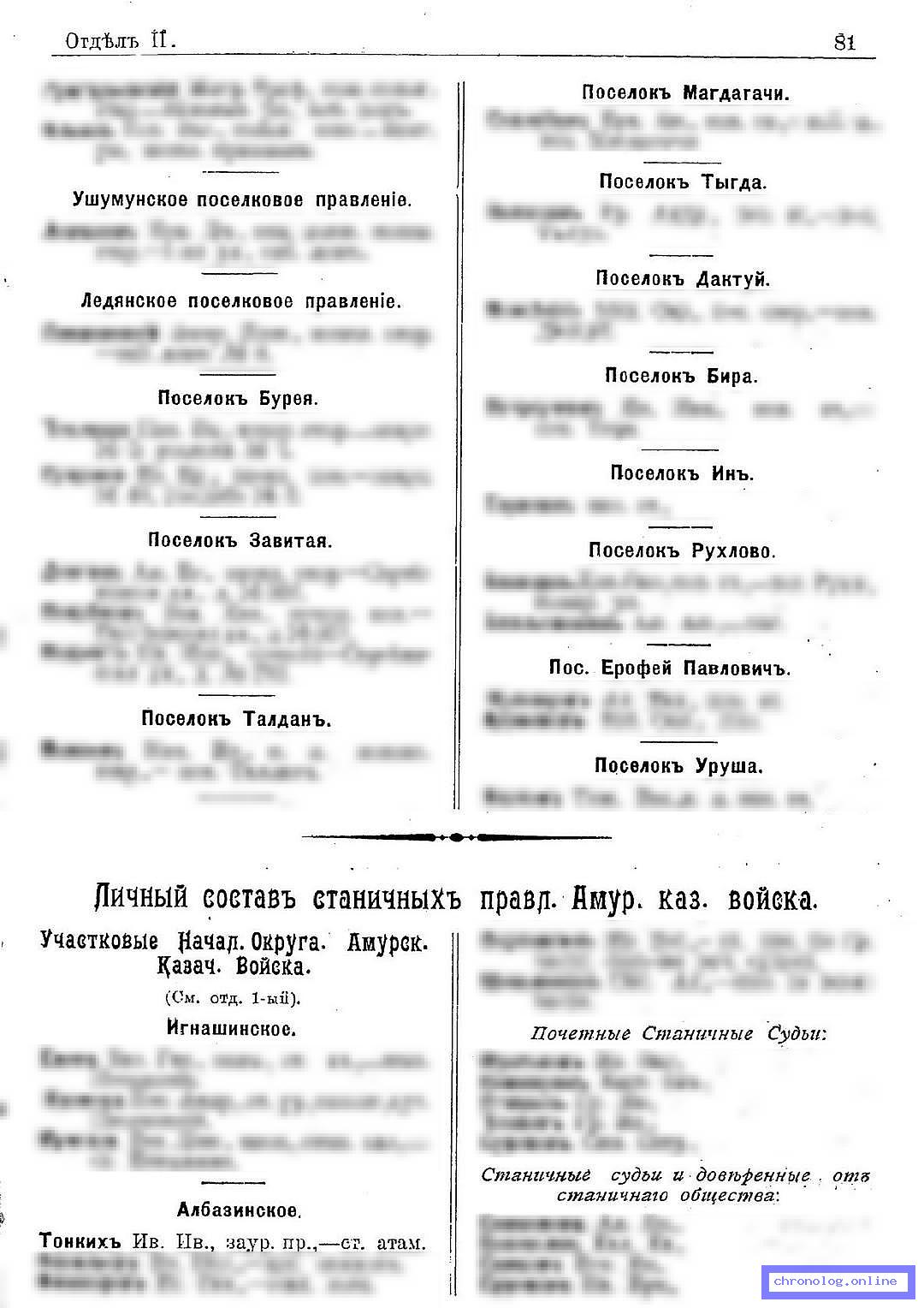 Разное СИ-АО-1915, стр.81 (Памятная книжка и адрес-календарь Амурской области на 1915 год): Правление Албазинского станичного округа Амурского казачьего войска. Станичный атаман Тонких Иван Иванович. Время и место исхода не показано. Снимки: 81. | |||