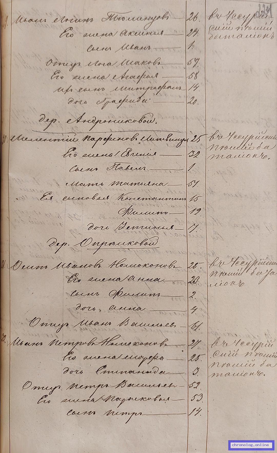 ГАЗК 30-2-270, Л.96, 96об, 214, 224 (Посемейные списки переселенцев на р. Амур): Казак 9-го пешего батальона Иван Логинович Тюменцов 26 его жена Аксинья 24 сын Иван 1 отец Лога Исакович 59 его жена Агафья 58 их сын Митрофан 14 дочь Глафира 20. Исход: деревня Митрофанова Нерчинского уезда. Снимки: 96, 96об, 214, 224. | |||